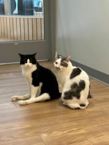 So, since Prescott is not nearby, I have made friends with Peabody. He and I can be seen curling up with each other almost every day now. We keep an eye out in the Lobby to make sure all of the kitties are okay. We can also see when visitors come by! But, I have to admit that I have not been so good about that lately—I have been having a blast running through doors and trying to escape.