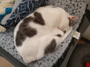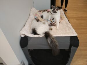 You know I have more than one kitty friend. Prescott and I have been enjoying each other’s company more than ever. We kind of have a system worked out. We play, we nap, we play, we nap… I find a hooman lap to curl up in or just nestle in Prescott’s crate. It has a nice soft and clean blankie and I love to take big yawns and just sleep for hours after breakfast and supper.
