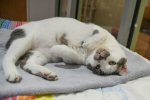 While I have been in very good spirits this month—and what kitty wouldn’t be here at Tabby’s Place and with all of the events and things to explore?— I did have a bout with coughing.  I have to get my bladder and colon expressed, and after this was done one day, I just started coughing.  But it did pass and I am being closely monitored by the vet staff and everyone! Hah! They can watch me all they want, but I, being Hips, will still give the staff and volunteers a run for their money.  Don’t worry, I am just fine.