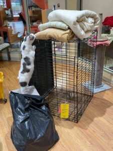 Catchin’ a ride on the cart volunteers use to bring our blankets and litter pans!