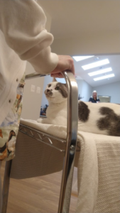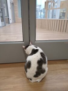 Then, I saw an open door and you know how we kitties like to explore.  Well, I am probably the best explorer here at Tabby’s Place. We had some issues with the air conditioning last month.  So the door from the hallway where the medical office is to the lobby was open for some airflow.  And there was a gate to keep us all separated.  But being my best nosy self, I just had to jump that gate and explore.  The staff and volunteers found me in the taboo territory and brought me back to the lobby.  But, guess what?  Yep, you guessed it—I jumped it again and once again they brought me back.  Our receptionist, Sharon, said that if I was human, I be an engineer because I’m so good at analyzing the edges and angles of anything new, like the gate in the lobby. Wheels just start turning my little head as I sum up how I will be able to jump it (so far, I’m 100% accurate)!