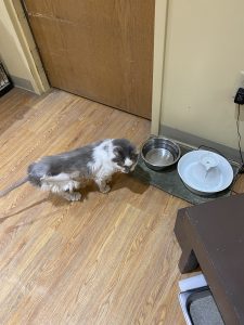I began to make more discoveries. Hobo likes being petted. He just needs to know someone better, and since I was the newcomer on the block, so to speak, he was a bit wary. But even more than “pets,” he likes food. Treats—nice yummy treats—and dinner. He’s part of what is affectionately called the “dinner gang”—the cutest group of kitties who hangs out near the doors that lead to the laundry room, where it just so happens all the meals are prepared. Magically, they all seem to know when that dinner hour is. And yet, despite his passion for food, his weight can fluctuate suddenly so the staff has to monitor him closely. And not just for that reason.