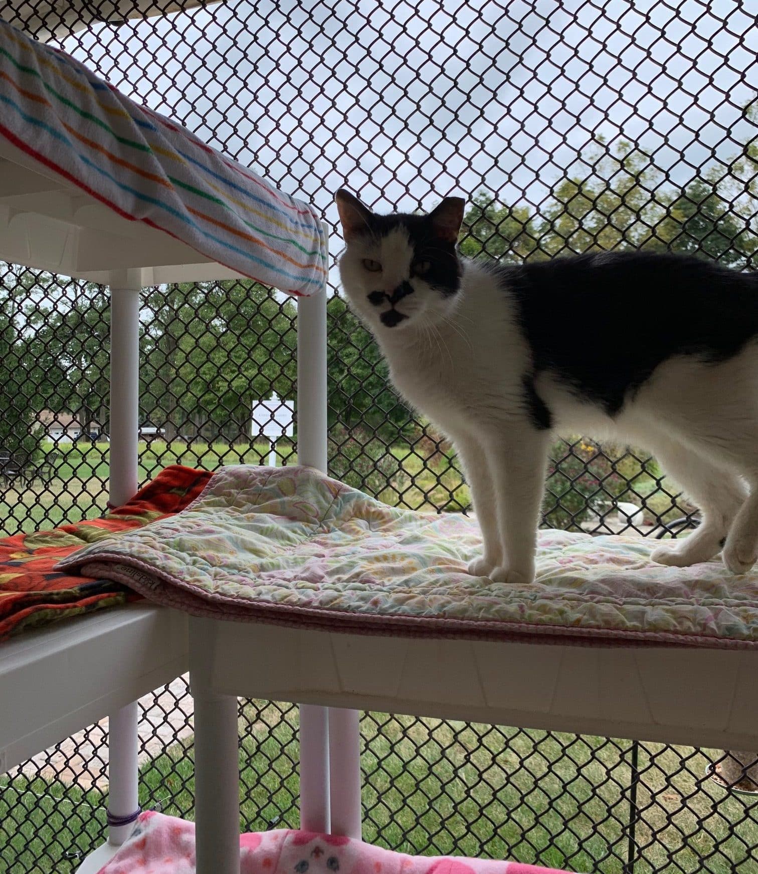 Every suite at Tabby’s Place has its solarium dwellers—those cats that spend all the time they can in the fresh air. True solarium dwellers don’t mind the heat, the cold, the rain. Lester is a solarium dweller. He is joined by Shea, Oscar, Rufus, and, more recently, JJ. Cisco comes and goes.