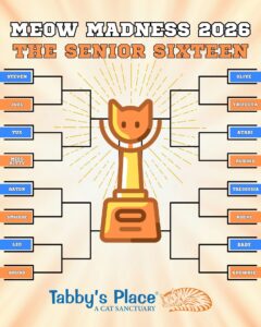 Oh, and have you heard about the March Madness Salute to Seniors at Tabby’s Place?   The first round of special brackets was posted on Facebook, featuring 16 of the finest, most gorgeous senior kitties.  Weekly voting will narrow the finalists down to one, who will be crowned the coveted “Meow Madness Champion.”