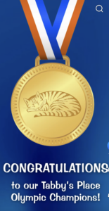 So, did you follow the Olympics this year?   Of course, I mean the Tabby’s Place Olympics!   There were so many great divisions, including wrestling (Trifecta), Strolling (Gator), Big Stretches (Hannah), Cat Tree climbing (Peabody), Gymnastics (Berry), Zoomies, (Deku), Wand Toy (Uni), and Scritches (Steven).