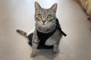 In the days since the festivities, Regina has been wriggling out of her scoot skirts, and it appears she has outgrown several of them. The sores she developed scooting around au naturel are healing nicely, but they can quickly return if she moves around without her protective clothing. New orders have been placed for some outfits in a slightly larger size and, clothes horse that she is, Regina has been flipping the pages of her kitty couture magazines for inspiration. After all, it’s not every fashion-forward feline who has an atelier of custom skoot skirt makers at her beck and call.