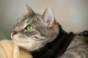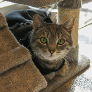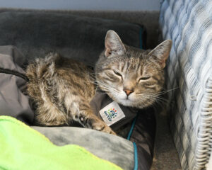 Recently, Regina had a few episodes of diarrhea, so she is now adjusting to a new GI Biome diet. Since the other cats in her suite are not on this regimen, she is crated at meal times. So far, this special diet seems to be helping her gastrointestinal system remain settled and happy. And, of course, raising happy and healthy cats and kittens is what Tabby’s Place is all about.