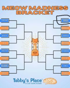 In our enthusiasm to escape cold winter’s grip and dance among the daffodils, we forgot how quickly Mother Nature can turn on her heels and bring on wild, windy, very wet days. Gray skies and disheartening drizzle began to cast a pall over everyone’s spirits. Something had to be done to return smiles to everyone’s faces … and, thus, Tabby’s Place’s own version of March Madness (Meow Madness) was born!