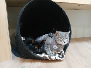 Kitty Purry and Leonardo Di Catrio, both doing well with their FIP treatment, have rejoined her in their shared suite. No longer on daily temperature checks, they are much more playful again. Regina really enjoys scooting around with her teenage friends, and active play is an understatement. When these three get together, there is just no stopping them!