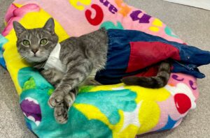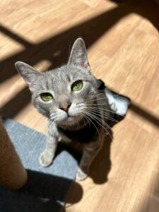 After all the hijinks and hullabaloo of celebrating Regina’s Olympic resolve here at Tabby’s Place, I truly despaired about writing this month’s sponsor letter. After all, how would I top the feline festivities culminating in our “elder cat,” Steven, carrying Regina on his shoulders around our facility while everyone hooted, hollered, meowed, and made other assorted vocalizations? It was such a beautiful display of warmth, wonderment, and truly deep affection for our charming little girl. How was I to top it?