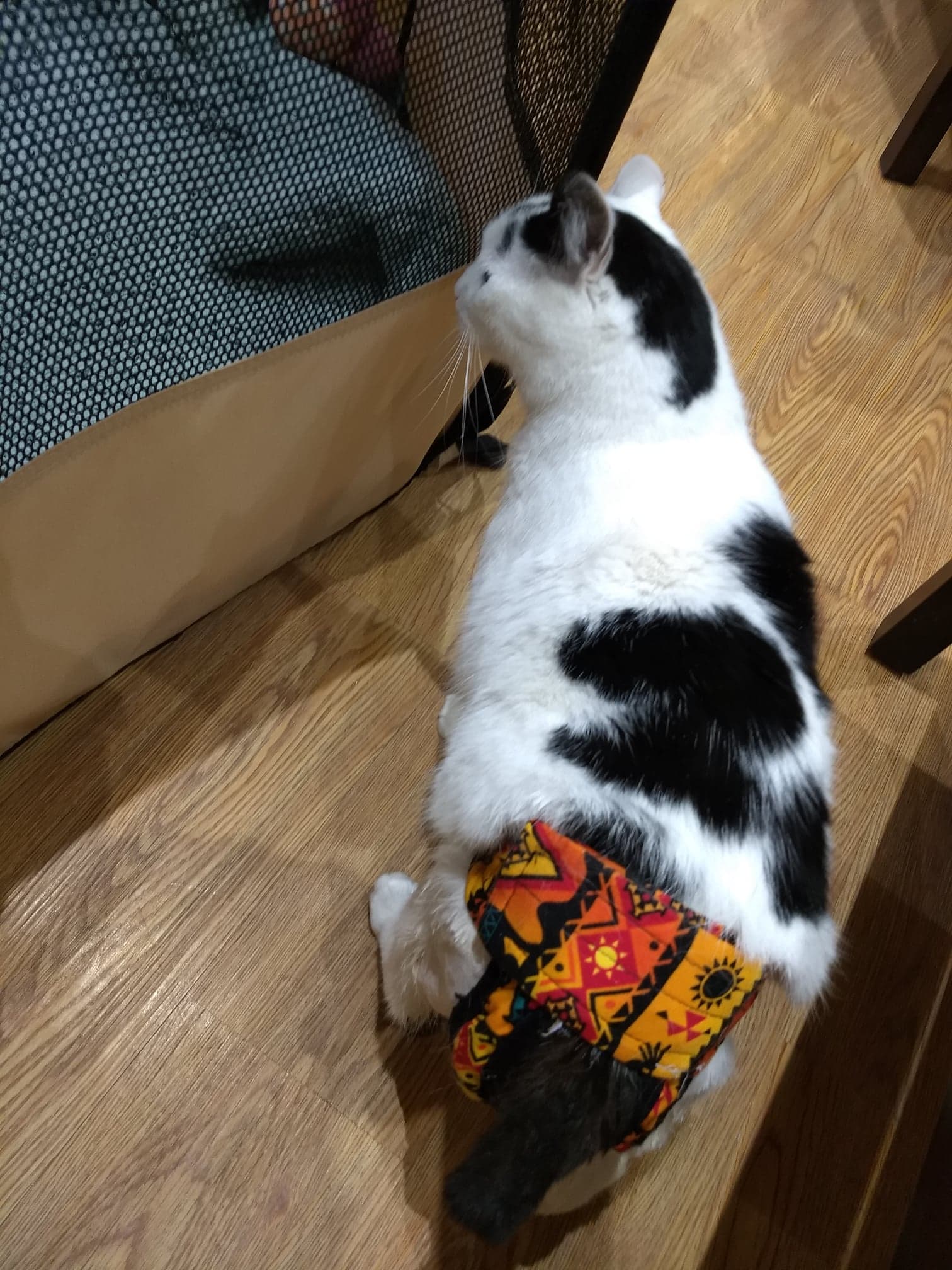 We continue to enjoy the generous gifts from the holidays, especially the cardboard boxes. I like boxes because they feel like secret clubhouses, and no one can see us. I am always looking into the suite windows to see which cats get the cardboard boxes first, it is like a reality show competition. I enjoy “visiting” the cats through the suite windows. Being in the lobby gives me so much freedom to walk around. The most playful award goes to the FeLV kitties who have enough energy to power the sanctuary. We just welcomed a new lobby resident, li’l Cotton the kitten. He is white, fluffy, and looks like a little cotton ball. Cotton is from the country of Lebanon, far away from Ringoes. I understand that he fell from a balcony and lost his feet. I stand by his playpen throughout the day to be sure he feels safe and welcome. Cotton and I are both in the diapie club (I might have to teach him how to remove his diapie when he is older —this is our secret).