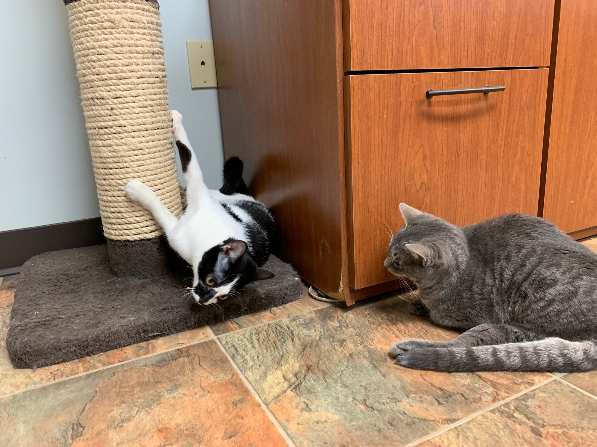 She’s making friends, but these things take time. June and Scoots have been observed in close proximity doing what can only be interpreted as “trying to play.” I don’t think either one has ever really had a feline playmate, so this is new territory for both of them. Scoots approaches Hunts as if to play, but it seems that Hunts isn’t sure what to do with her when she scoots up and sniffs his tail. But Scoots has her eye on a new prospect. Nina has cerebellum hyperplasia, so she has trouble with balance. She moved into the Community Room just this week. Scoots is rather fascinated by this new cat that moves like no cat she has seen before. Both are under a year and very playful, so perhaps they’ll figure something out together.