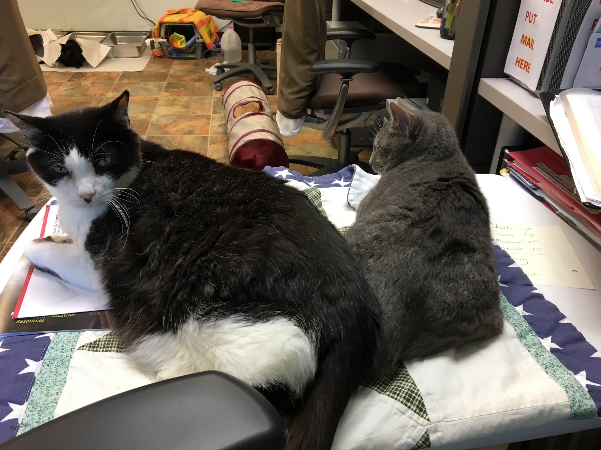 Scoots loves her pink bed. There is nothing particularly special about this bed from the human perspective, but that matters not to Scoots. It is perfectly sized, and not too plush, which makes it easy for her to crawl into and also easy to drag around to a new location. Scoots has settled into life in the Community Room. She is now accepting of love from many more folks and is happy to curl up in a lap, or on any desk, that presents itself. In a never before witnessed encounter, Scoots was even willing to share her napping desk of the hour with Puzzle!