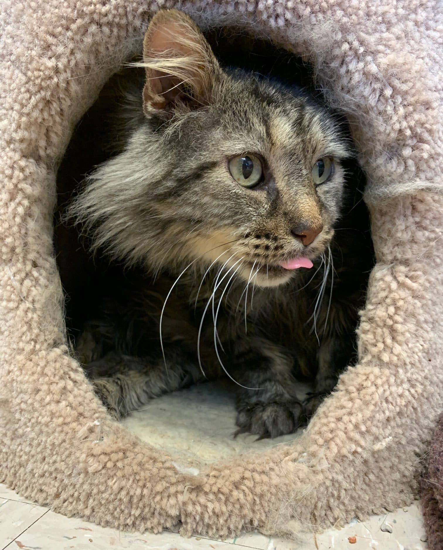 Stafford is sporting his full coat these days, but that may have to change. He is not the best at personal grooming, so needs a hand from his human friends and visitors. If by chance you pay Stafford a visit, he would enjoy some gentle brushing along his back and body. He is not the most patient for grooming sessions, and he is currently quite matted. I have heard a rumor that perhaps it is time for a shorter cut for the season. He is going to require a bath at the very least to get him smelling fresh once again before he makes his next Aged to Purrfection visit.