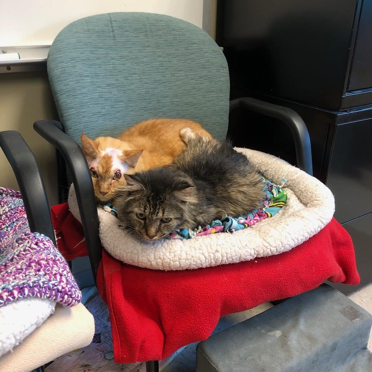 Stafford and Inigo Montoya have officially become buddies. They have been spotted curled up on a chair together and awaiting dinner and treats at the office door side by side.