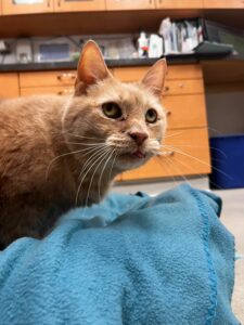 Fortunately, Steven has been his usual happy-go-lucky self this month, and dining has not been a problem. However, our orange fluffball has a new habit: It seems he’s decided to begin collecting things. Perhaps he’s inspired by all the busy squirrels outside the medical suite’s windows.