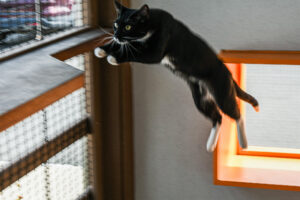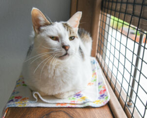 I’m happy to be able to tell you that there is also very little news for our other FeLV+ suite residents. I’ve had a few concerns about Clifford, who I suspect might be bullying the girls, but to date, I’m the only person who has witnessed any of this. I only saw it happen once, and neither Batty nor Hoopla Green has had any injuries or altered behavior. Read more about Clifford, the financial tycoon, in a recent blog titled Cliffordable! Hoopla Green has been reveling in the “extended summer” we’ve had in NJ this year and loves to sit on the highest shelf in the solarium, clearly very interested in what’s happening outside.