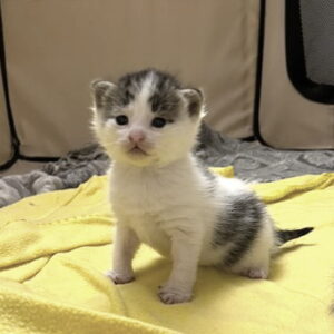 Polka (pictured above) is a male feline-leukemia-positive black kitten who is a “total lovebug and VERY vocal,” says foster mom Jill. She notes he will be destined for Quinn’s Corner after his quarantine period is over.