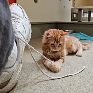 Speaking of Bode, one afternoon I was talking with volunteer Kitty LeFey in the hallway outside the Suite A solarium, comparing notes on recent interactions with one particular cat. We turned our attention to an approaching visitor and saw that he had Bode in his arms. He explained that when he and a female visitor opened the door to exit the Kitten Suite, Bode slipped out too. (She must have decided she wasn’t done with their company.) And as you see on this screen, Bode also enjoys playing with a visitor’s shoelaces.