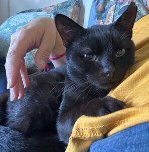 Now, time to catch you up on a few of the kittens you are supporting: Corduroy (shown enjoying cuddle time in a photo by volunteer Ruth) experienced several seizures, and his medication dosage was adjusted by his neurologist. As if that wasn’t enough, he’s being treated with antibiotics for an upper respiratory infection. However, they tell me he’s happy in the Lobby and loves to play with Berry or, for that matter, any cat who is willing…