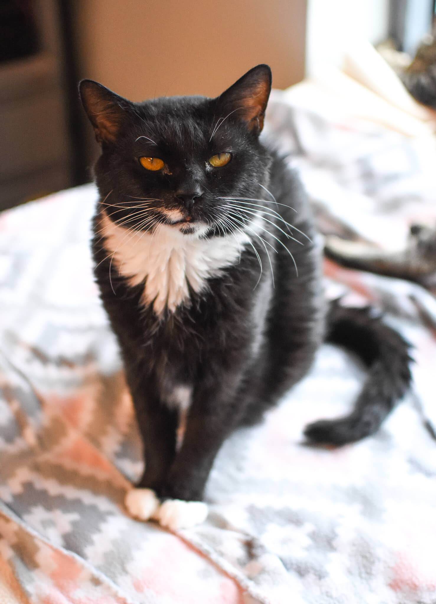 The start of every new school year brings new kids to the mix. The same is true in the Community Room. Our newest resident is a little black-and-white youngster named Paige. She was part of a litter of three, but her siblings were adopted and she was the least socialized of the bunch. She has joined the Community Room to get a bit more comfortable around people. I have yet to see her interact with Tux, but he’s always been good with the young ones. If Tux were a school kid, he’d be one of the ones to invite the new kid to join him for lunch to help them feel comfortable and welcome. That’s our Tux—a handsome gentlecat at heart.