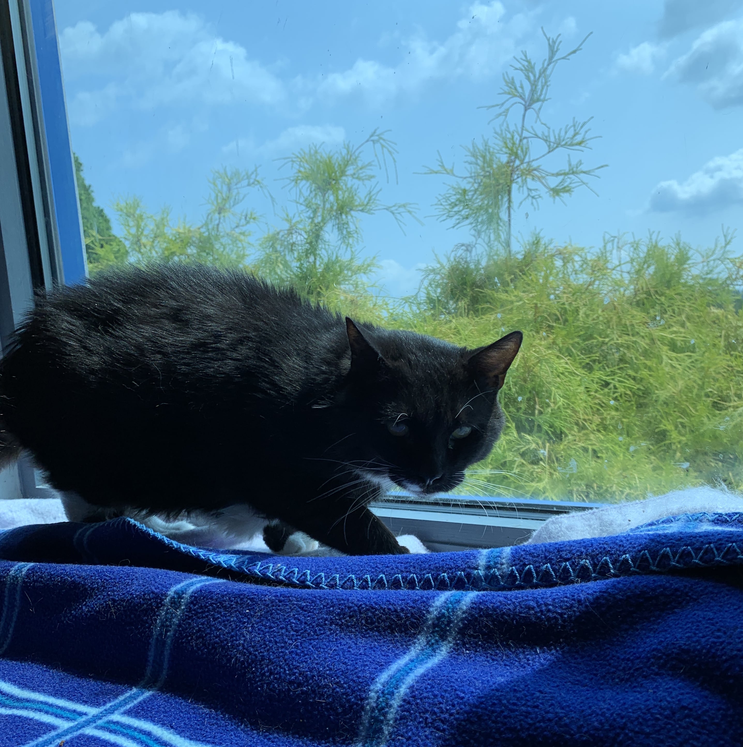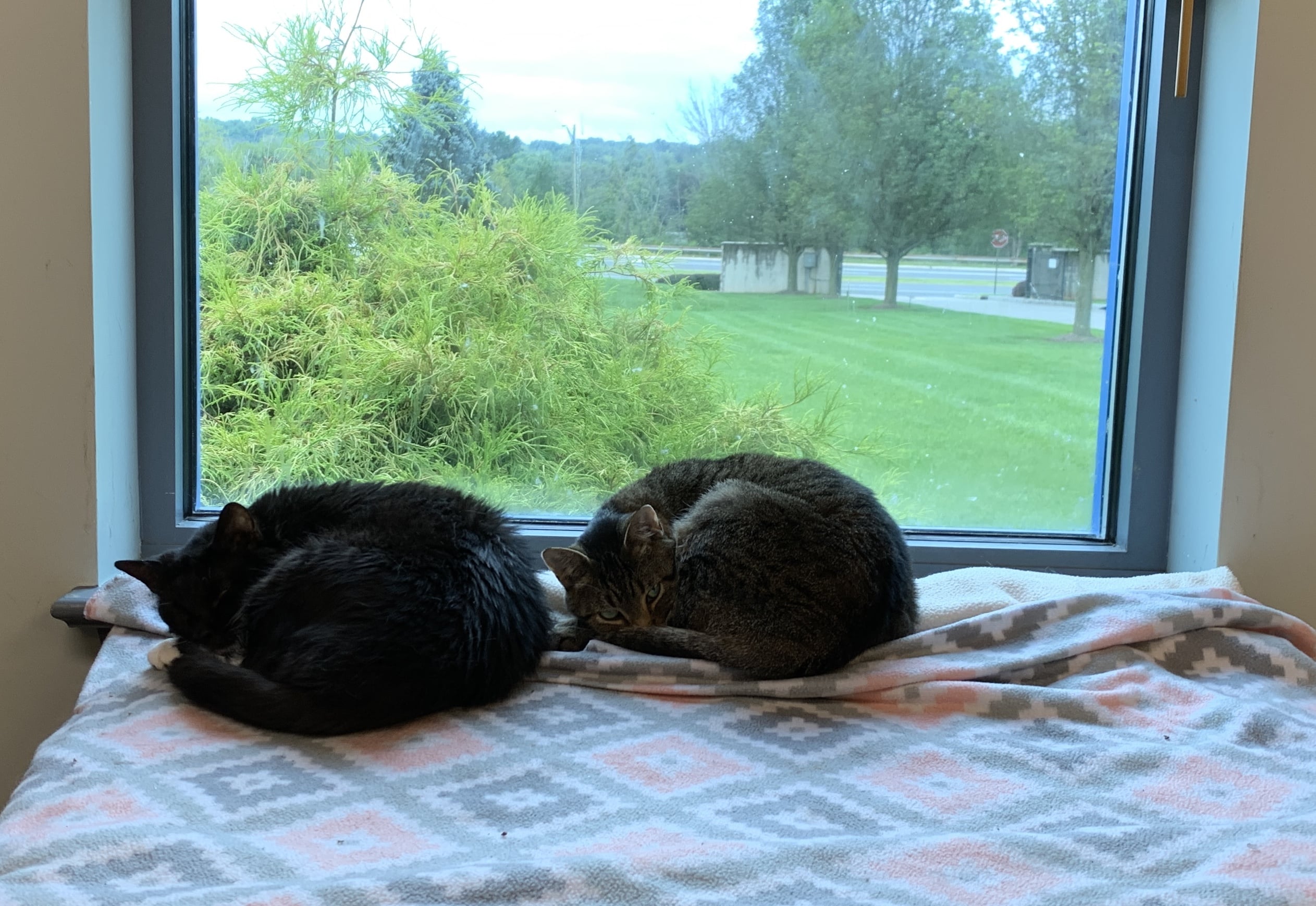 For several weeks Tux seemed to be distancing himself from the other kitties of the Community Room and finding solitary beds in which to nap. During times of quarantine, you need a little space to yourself every now and then. But in the last weeks, Tux and Sammy have once again become frequent window buddies. While the photos don’t do the scene full justice, the pair was napping in identical positions just last week and I was able to capture a quick shot before Tux lifted his head to glare at my “rude” disturbance.