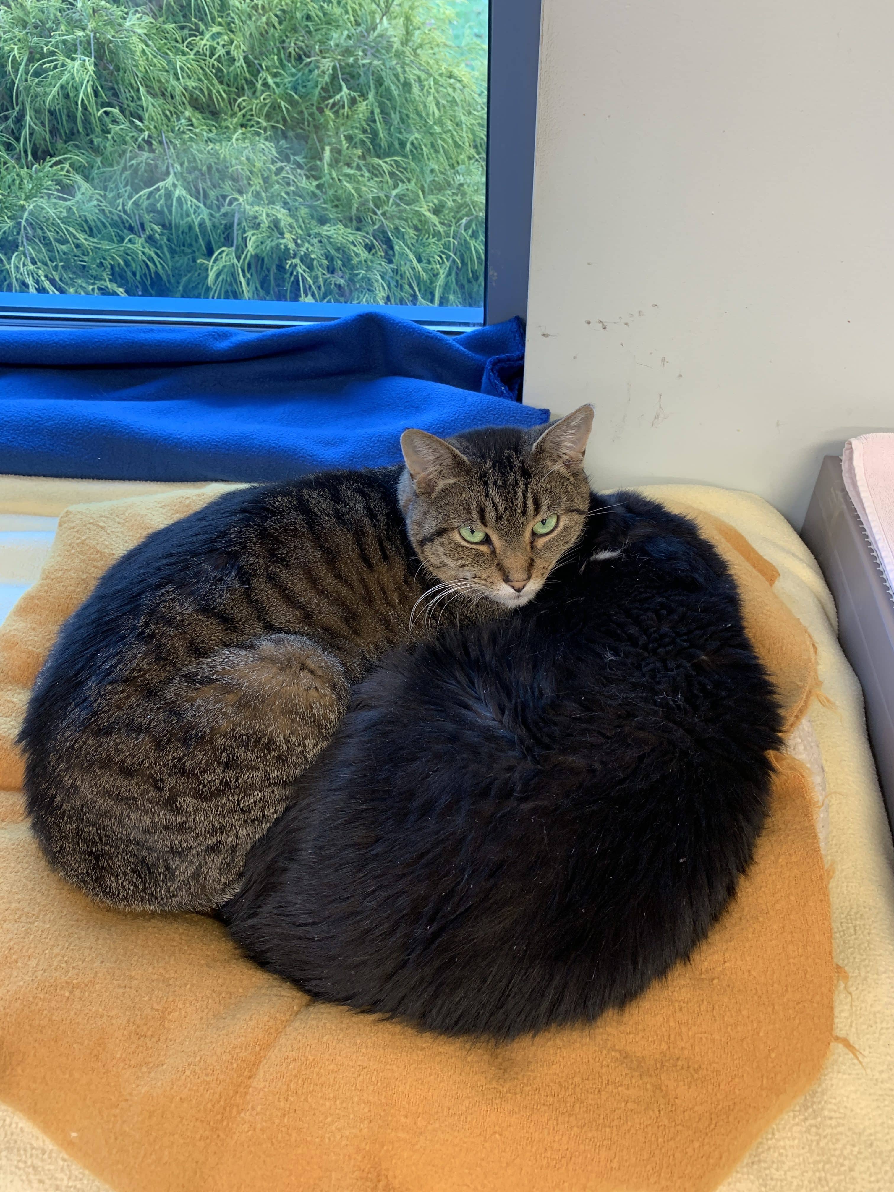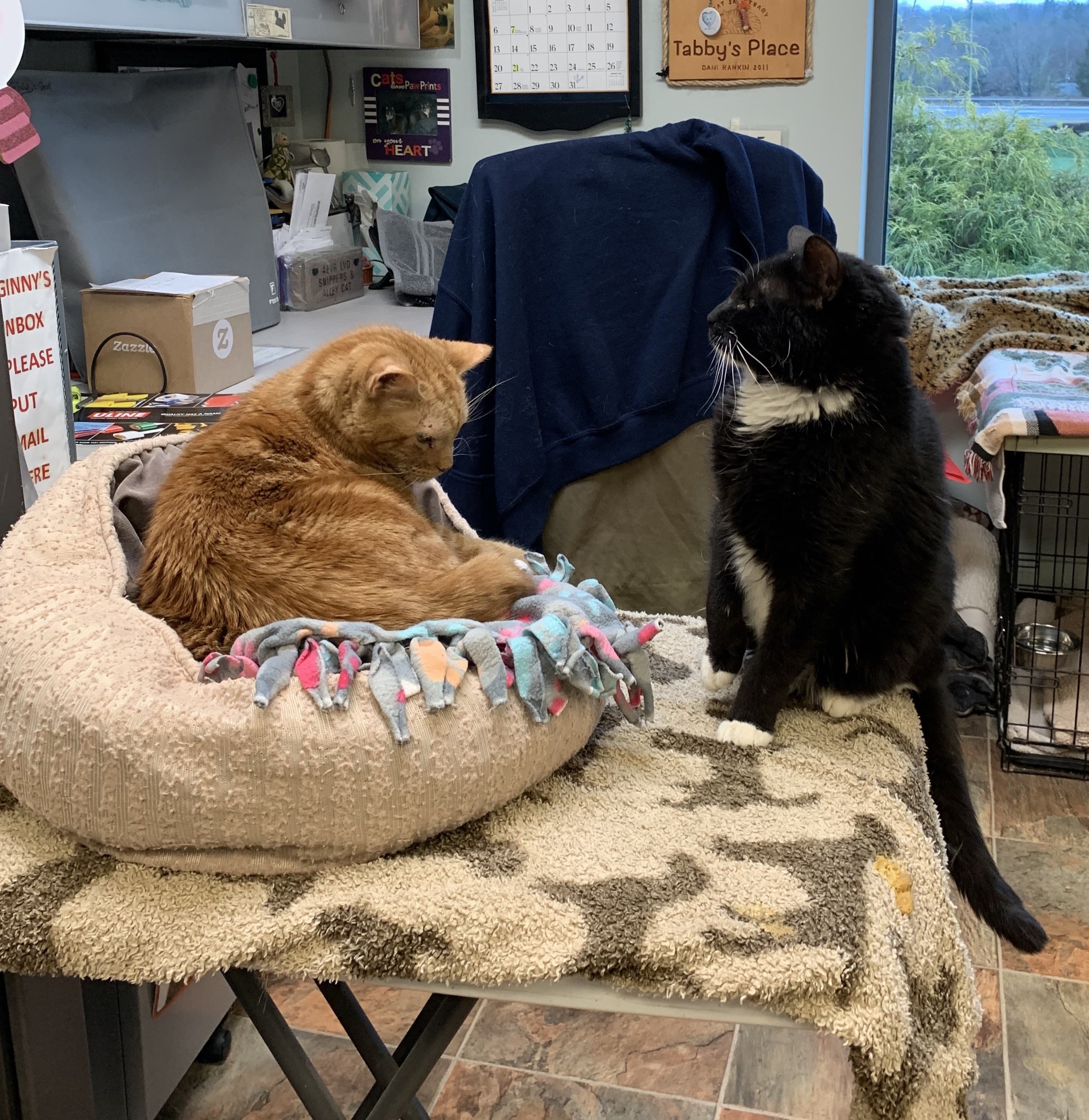 When I watch Tux and Sammy snuggle together, my heart begins to warm. Even in the midst of a busy day of feline care, the magic of feline friendship is worthy of a pause. Note that the two cuddled photos of this duo were taken on two separate days by two different staff members. It is not just I (the correspondent) who is moved by their friendship, it is every one that enters the Community Room of Tabby’s Place and witnesses their warmth.