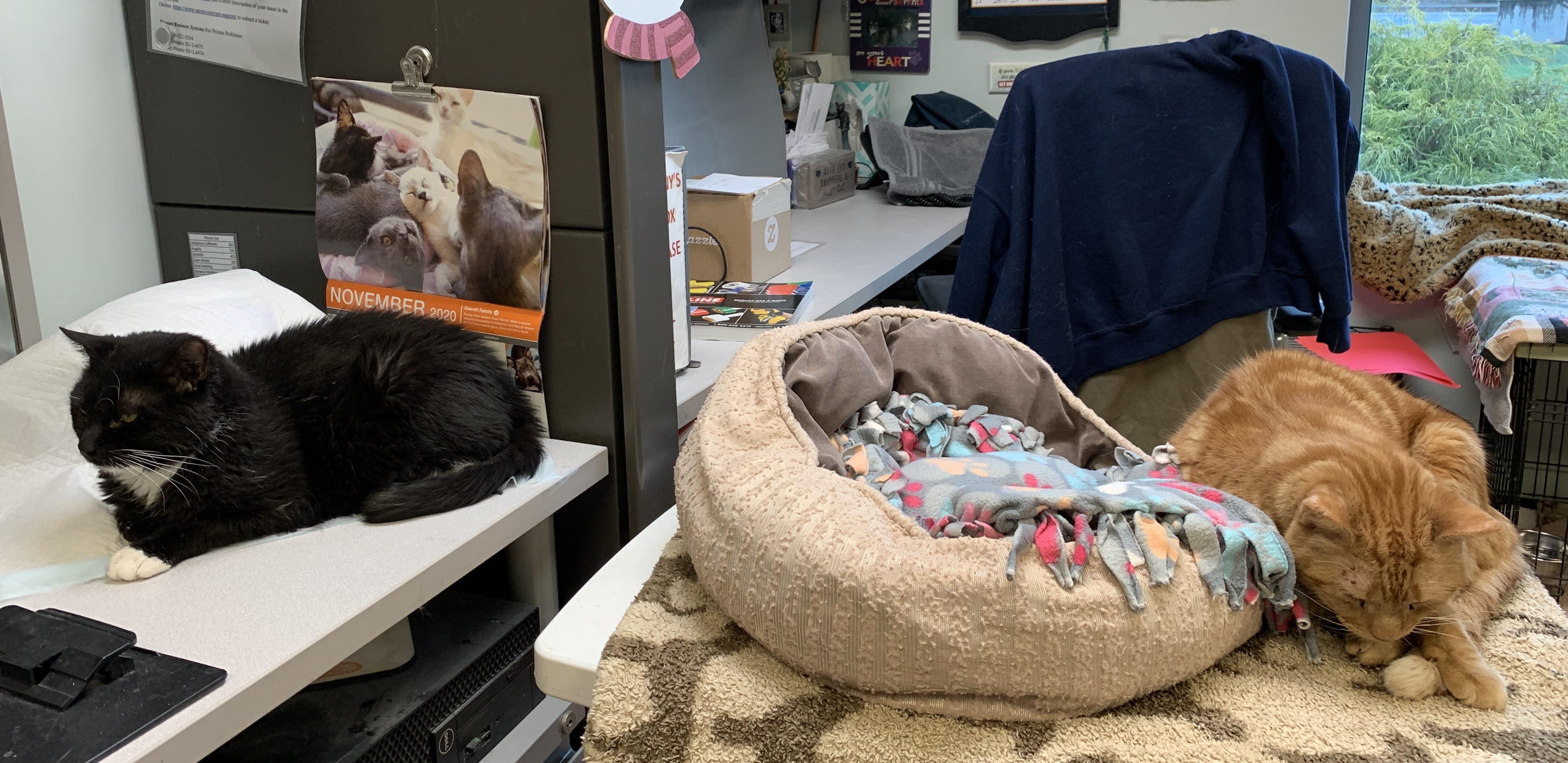 Tux has a reputation for being most welcoming of newcomers to the Community Room. He is good with the young and the old. Lately, Tux has been perplexed by a particular newbie to the room, Indiana. Indiana is a quirky kitty. He is an older guy, like Tux, but he doesn’t really welcome affection from others—human or feline. Yet Indiana has a bold and adventurous spirit and doesn’t shy away from confrontation. He is a master at staring down his roommates long enough to make them squirm. I’ve witnessed several encounters between Indiana and Tux. These moments demonstrated Tux’s more hidden qualities. He stands up for injustice but ultimately seeks peace.