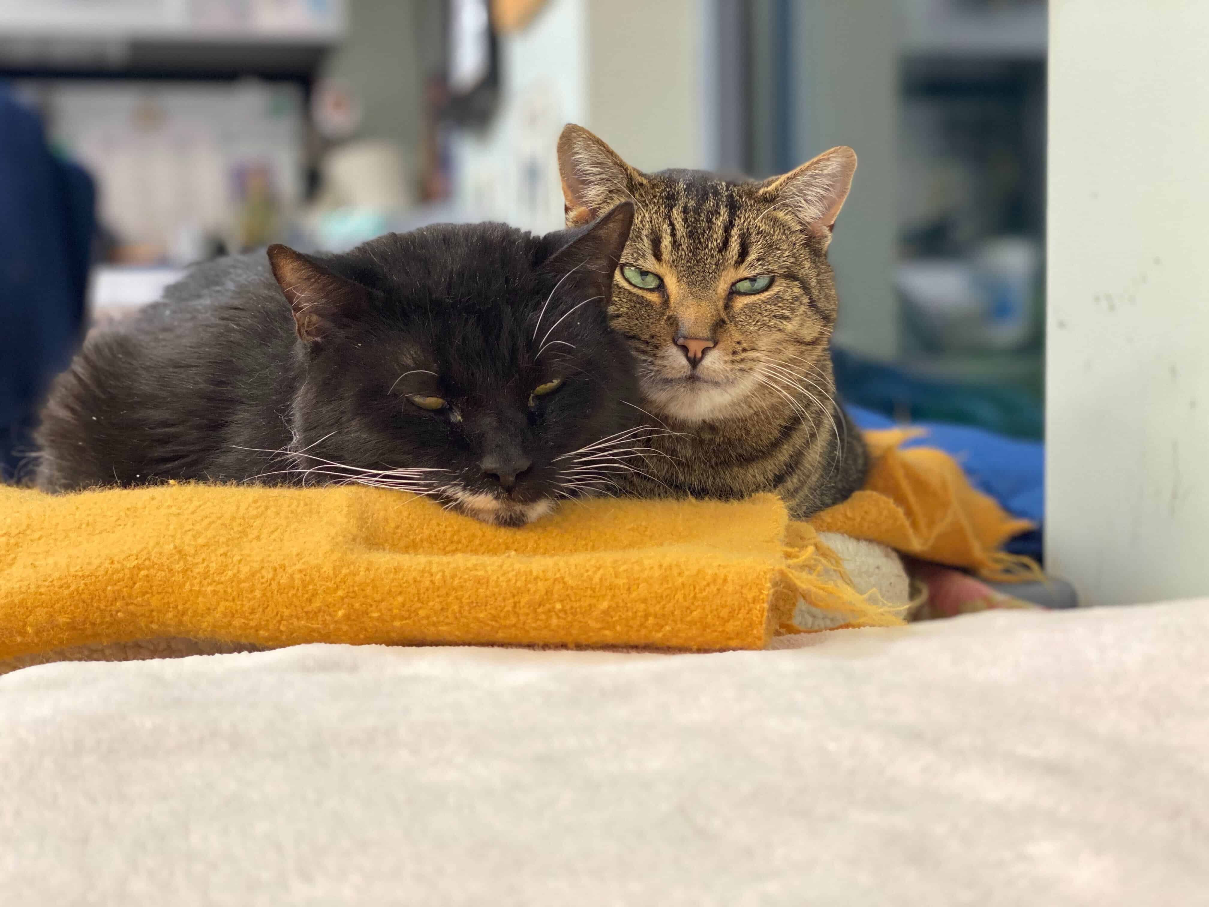 The friendship of Tux and Sammy runs deep and is a constant in the Community Room. Sammy does accept and appreciate human love, but she is comforted by the presence of other friendly felines. Sammy always accepts pets from me when she is snuggled near Tux. She is more cautious when napping alone in a cat tree. You can sample the sweetness by watching here. When I began petting Sammy this particular afternoon, she began nudging at Tux as if asking him for more love and comfort as much as asking me for more pets.