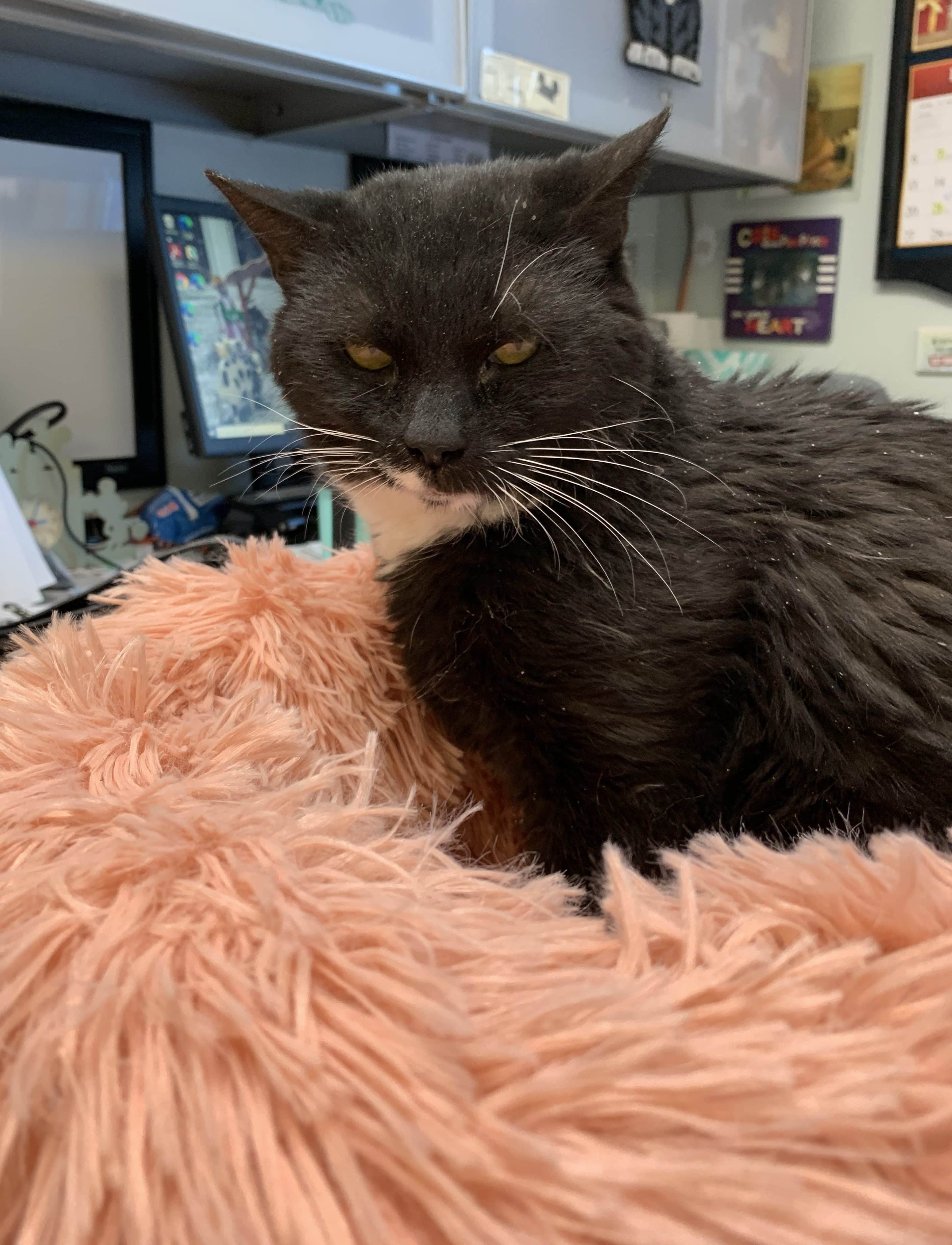 When Myrna discovered the pink poof, there was no turning back. Myrna is old, arthritic, and incontinent with a host of other health issues. We keep her comfortable and content with minimal medications and fluids. Myrna loves her Fancy Feast kibble and spends nearly all of her days napping in warm cozy spots. In spite of her arthritis, she climbs stairs to warm windows. It is unclear precisely when or where Myrna first discovered the pink poof bed, but she was instantly captivated by its snuggly softness. The next thing we knew, Myrna had figured out how to climb onto the office desks just to get to the beloved bed.