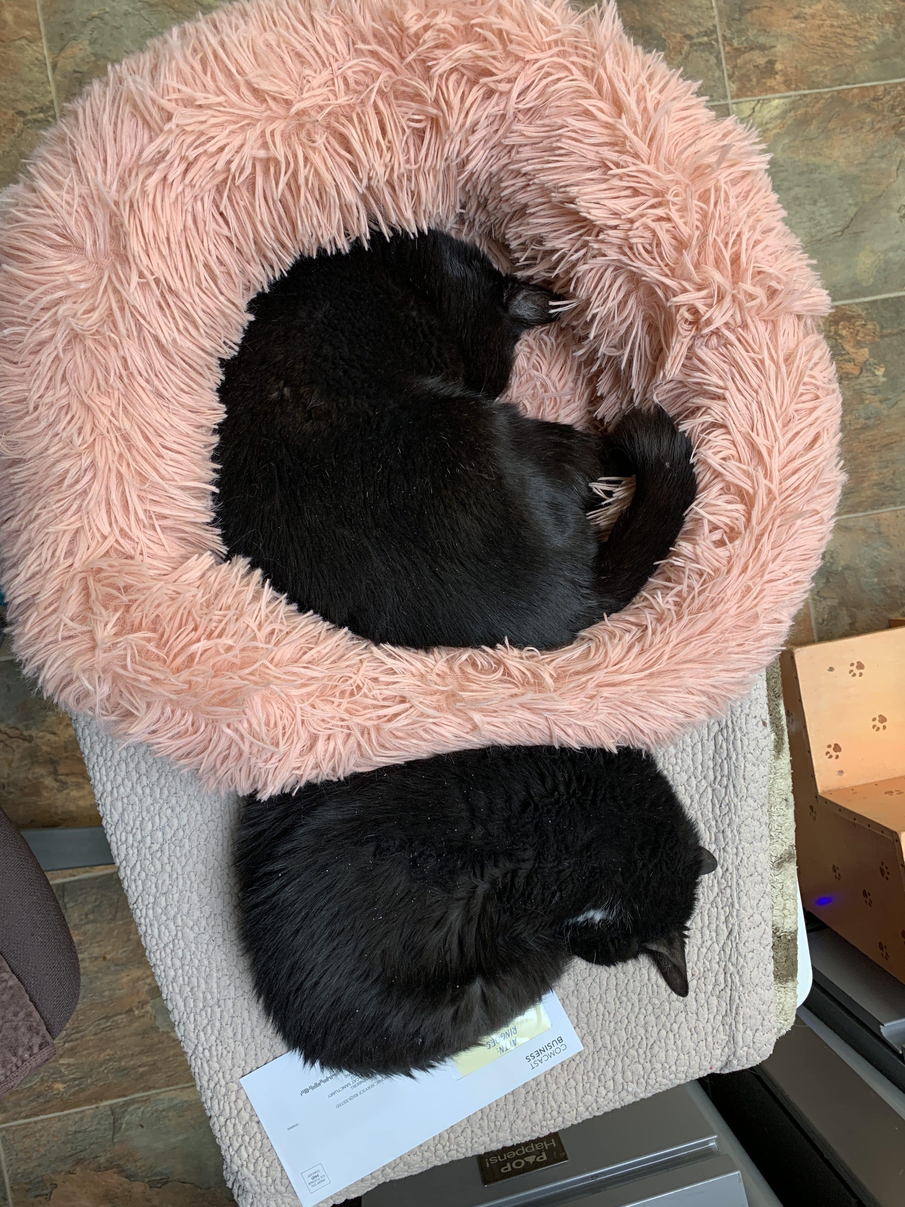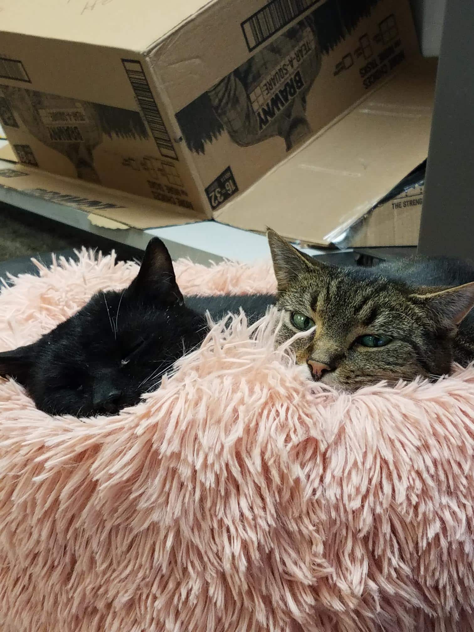 After learning of Tux’s troubles with Indiana, a dear feline friend sent Tux a special holiday gift of a super fluffy pink poof bed. Upon opening, it took Tux all of thirty seconds to decide that this was indeed the best bed ever. He settled right in and was soon joined by his friend Sammy.