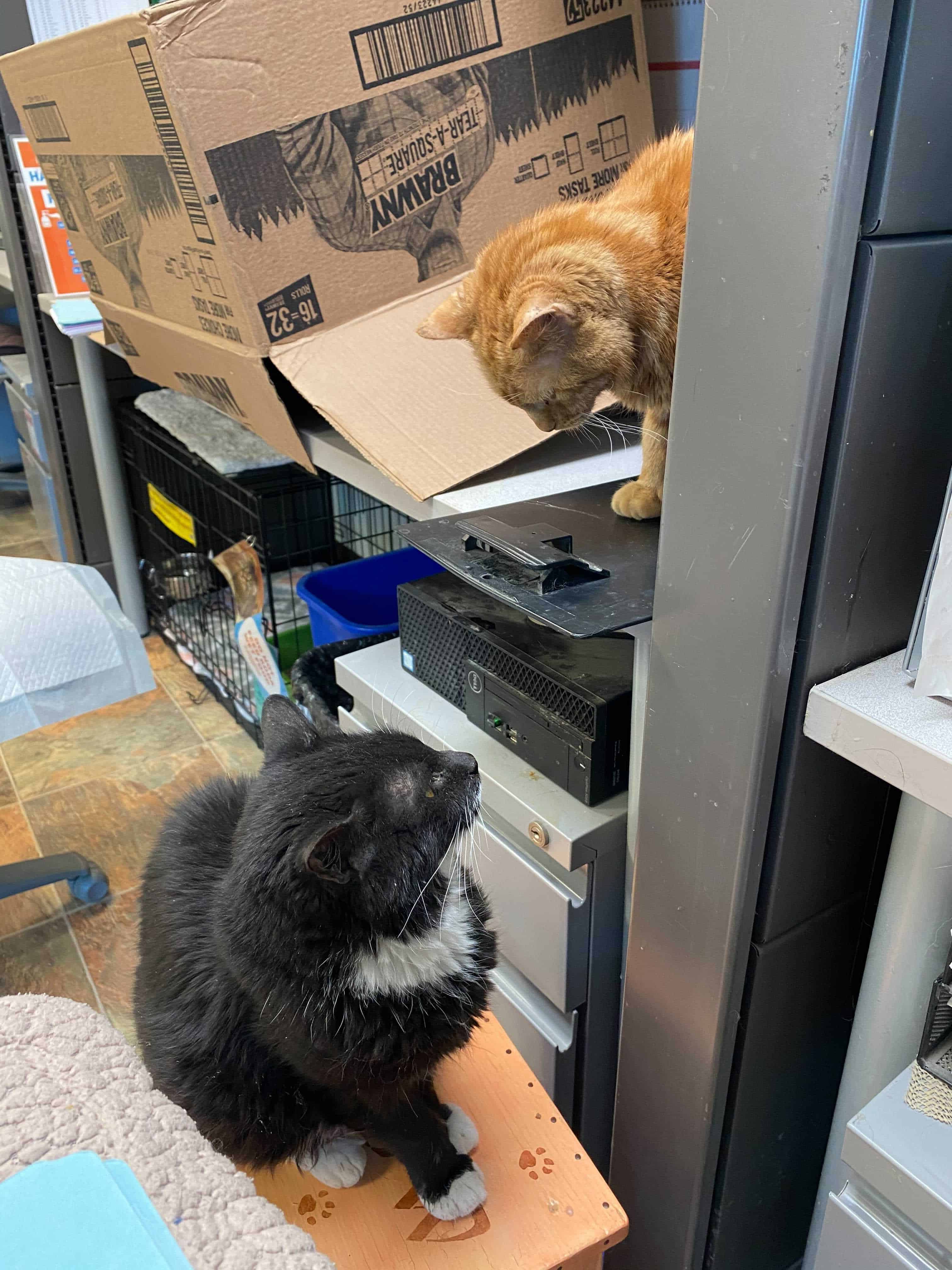 Since this singular episode at the beginning of the month, Tux has been back to routine physical health but is experiencing increased levels of psychological stress surrounding roommate issues. Tensions between Tux and Indiana have returned. There have been mornings where the physical evidence (black fur tufts) indicate overnight scuffles. In order to alleviate overnight tensions and address some of Indiana’s health issues, he is once again being crated overnight while the cats have the building to themselves.