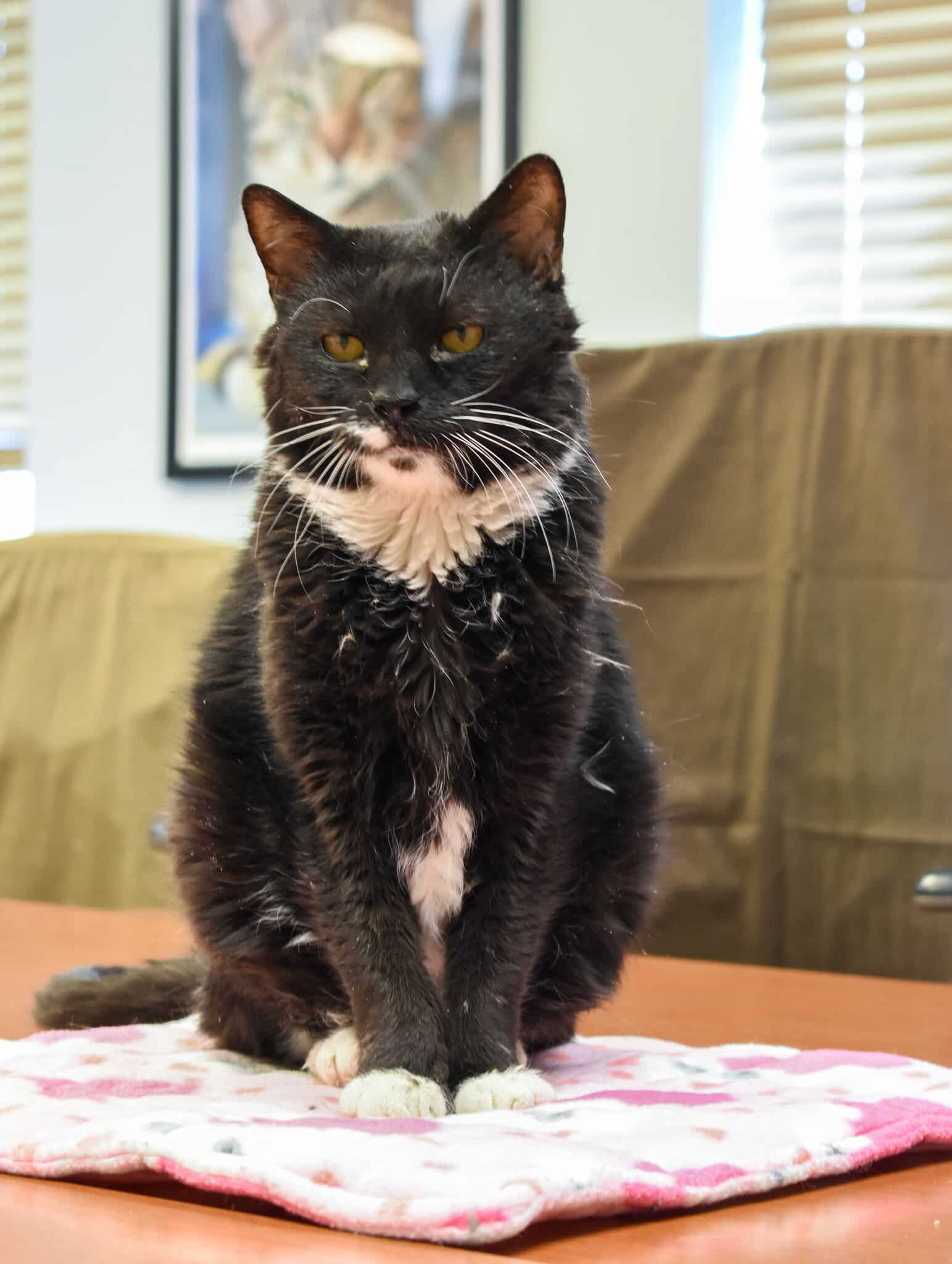 Now that space for two (or three) is no longer necessary, Tux can resume his role as an administrative associate and return to the perches he loves most—those at the desk of our administrative assistant, Ginny. Tux lights up with that special sparkle on the days that Ginny is working at Tabby’s Place. He will wake from a nap and come trotting across the room to spring to the table where he can oversee the day’s activities. This brings great joy to Tux and Ginny alike.