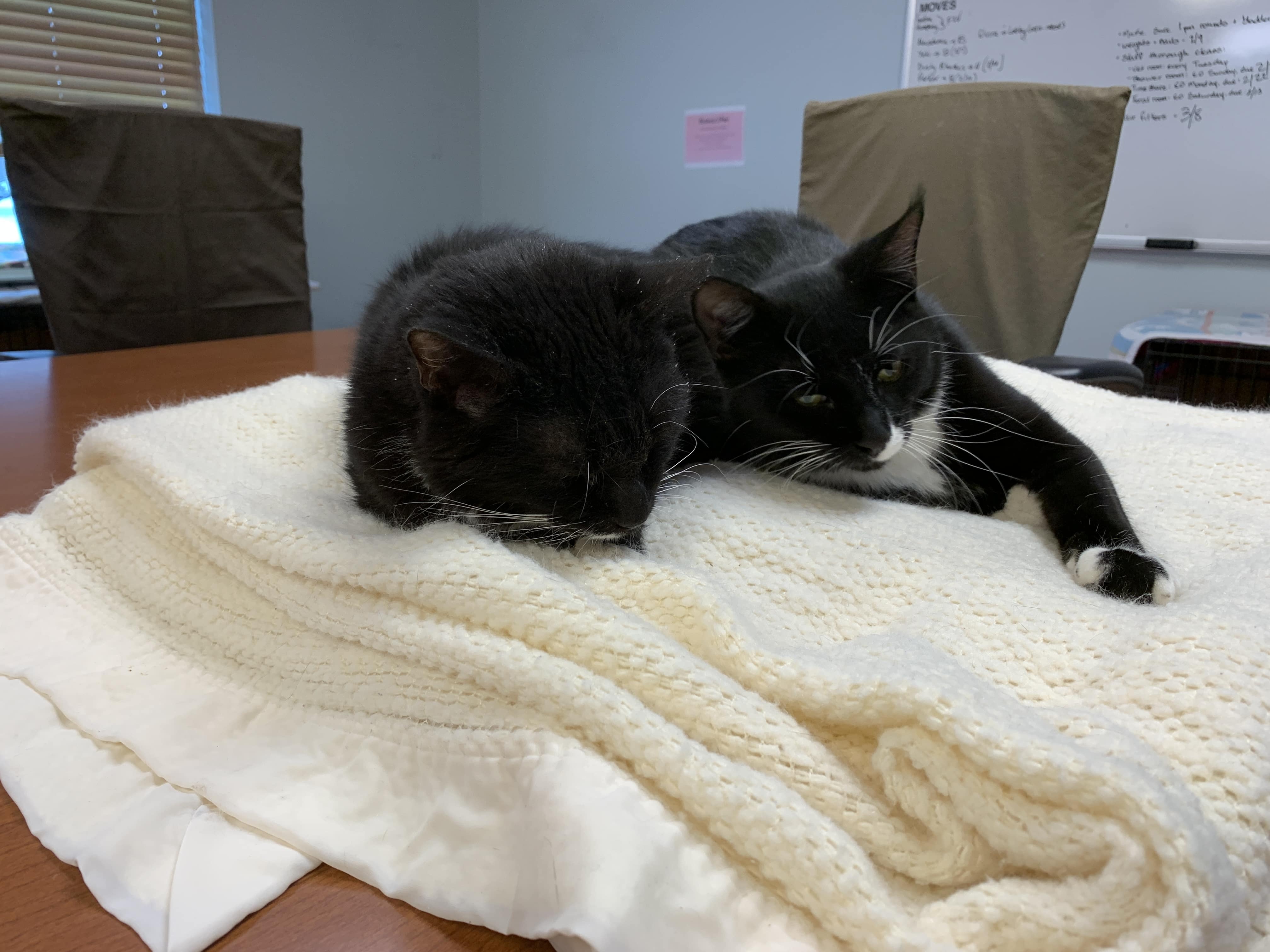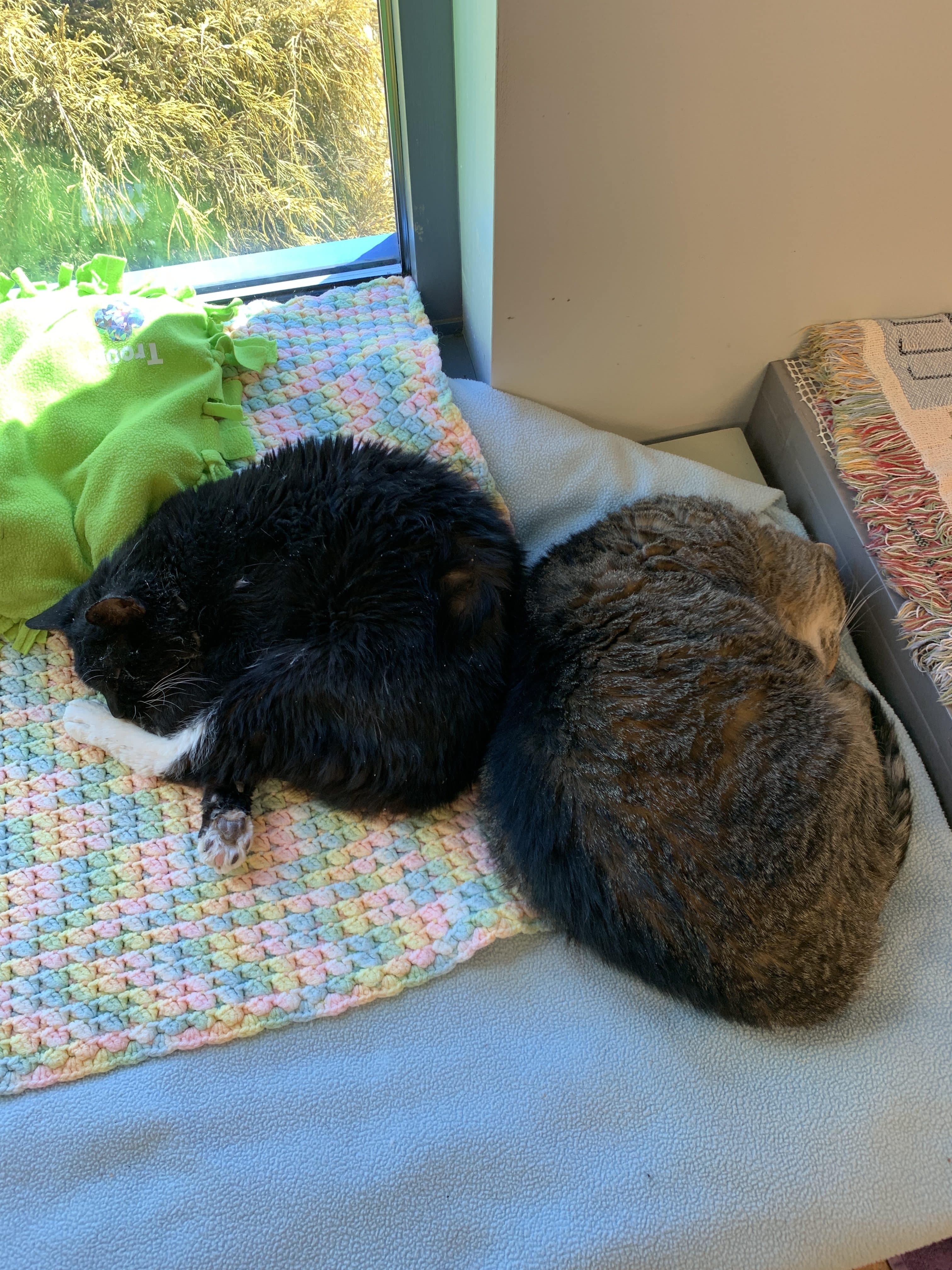 While Tux appreciates his alone time, he does enjoy the company of other kitties. I am happy to report that Tux has made a new tabby friend in the Community Room. Koda has been a resident of the room for quite a long time now, but she tended to keep to herself much of the time. But Tux and Koda share a common love for warm and sunny windows, and it seems now that the youngsters have left, these two mellow adults have found a friend in one another.