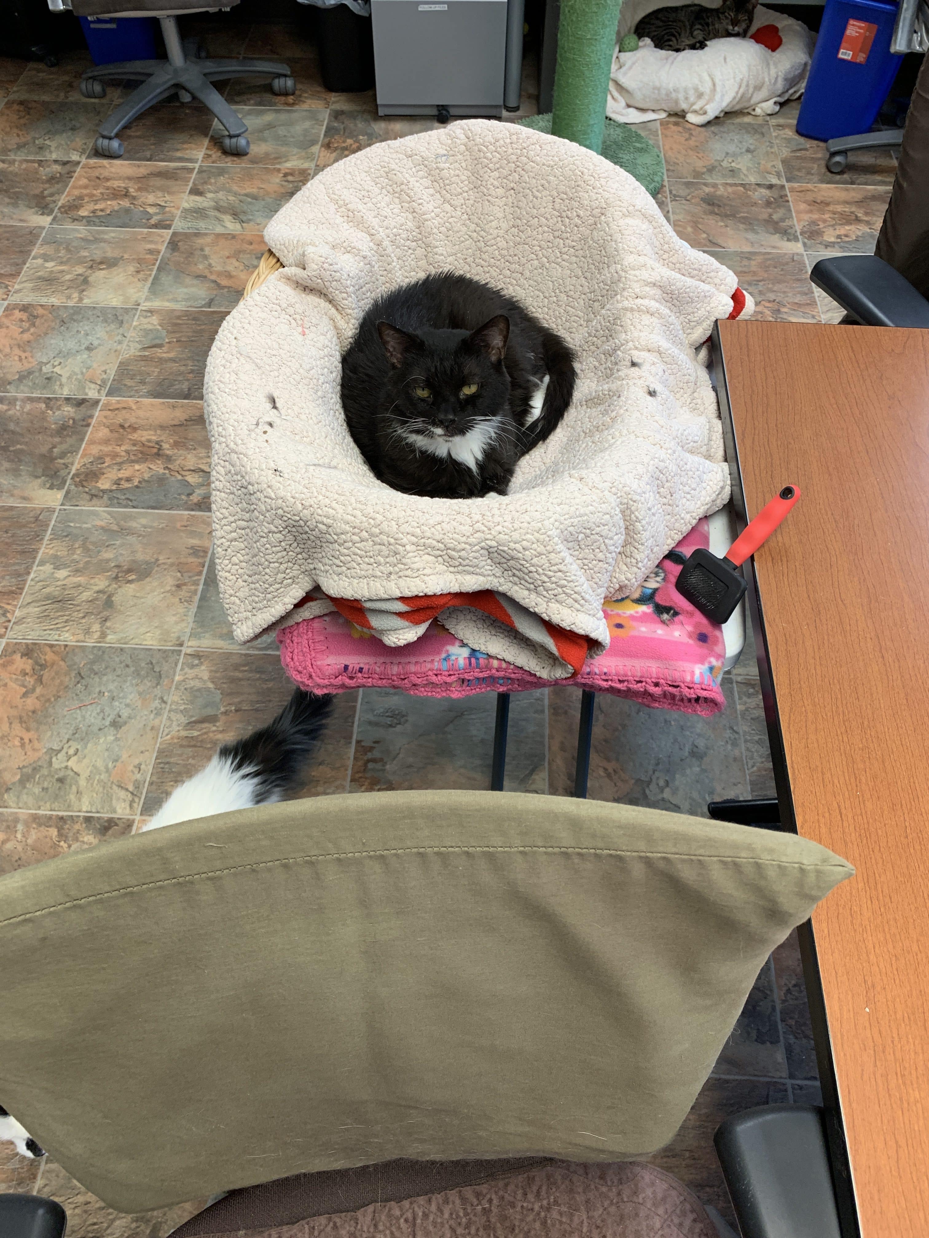 I’ve explained how Tux comes to greet me on the days that I work in the Community Room and settles down for a good grooming session and visit. One day this month we had an unusual interruption to our routine. I was hearing construction workers at work above my head and was a bit wary that they sounded so close. Soon our Director of Operations arrived to inform me that the crew needed to access the ceiling above the desk where I was working. Tux had just settled himself into the bed on the table to my left so I decided I’d simply move his table so as not to disturb him. We spent the remainder of the day working together in our temporary arrangement.