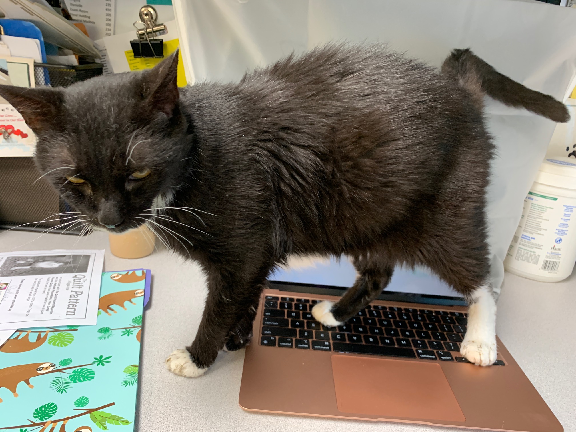 Our administrative assistant has been away recently and Tux misses her terribly. He loves to share the corner desk in the Community Room, so our Wednesday visits have been extra special of late. Tux even took the opportunity to assist me with morning medication rounds. I entered the Community Room, placed the medical book on the conference table, and left to get some needed supplies. When I returned just a few minutes later, Tux was waiting for me and keeping my place in the book (see photo).