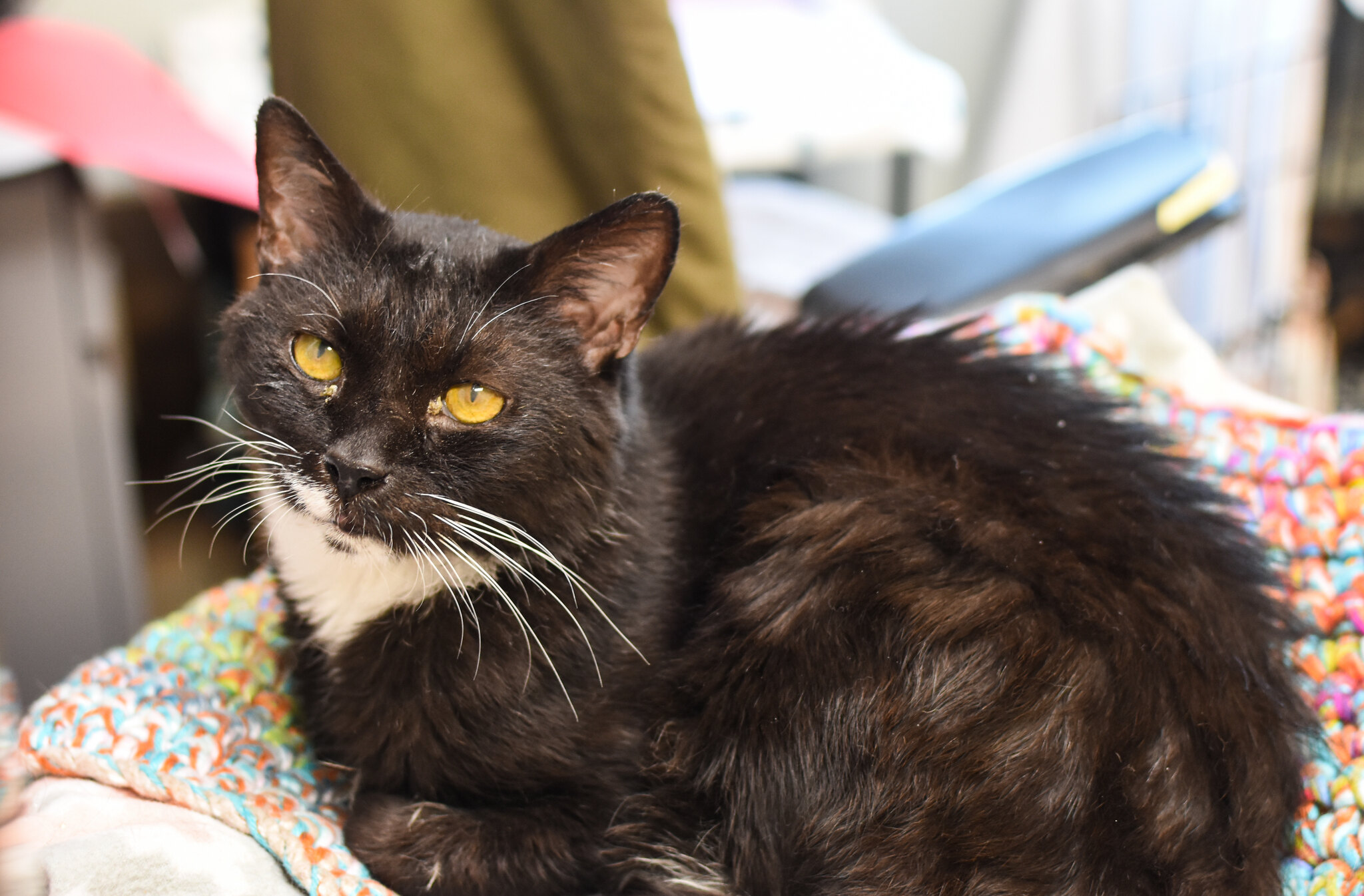 Tux was “evacuated” to the Intake room in our holding area. He was the lucky kitty that got to free roam in the small room, while his more “nervous” roommates were crated in the room overnight. While Tux appreciated the freedom, he did not enjoy being away from his routine and familiar space. Tux has always been an easy-going sort of guy, but it seems that as he ages, he is more a creature of routine. Routine provides security, just like humans provide comforting pets.