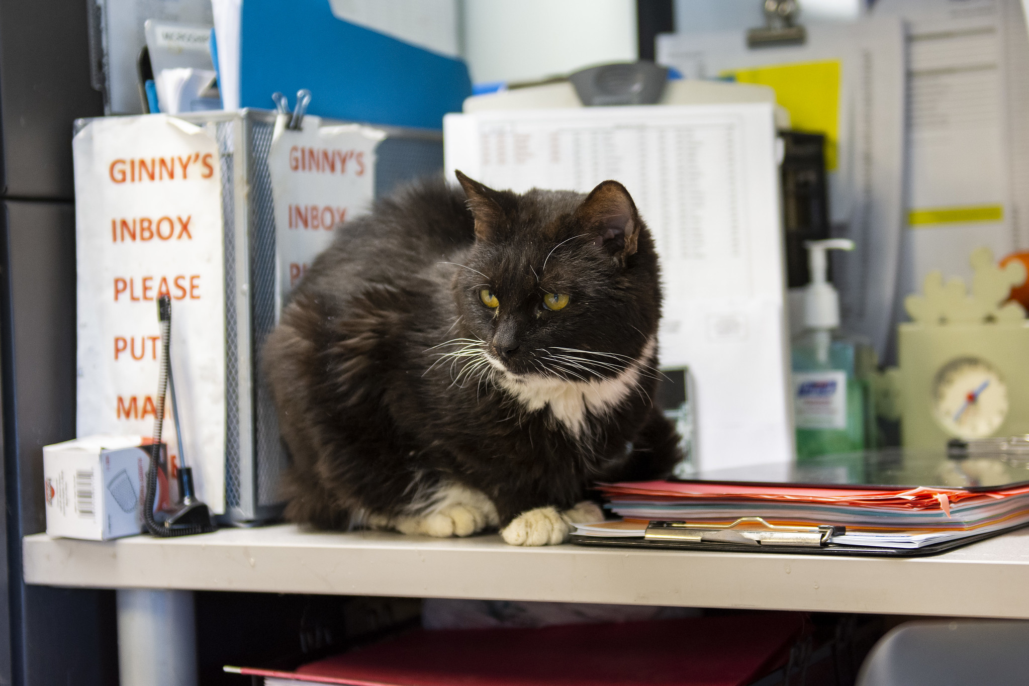 A few weeks ago, Tux got to assist with a special mailing project in the Community Room. If you recently received your year-end giving letter with a special photo of Tux, there is a good chance that Tux gave it his personal stamp of approval. Tux sat on stacks of paper, rested in boxes of supplies, and sniffed photos.