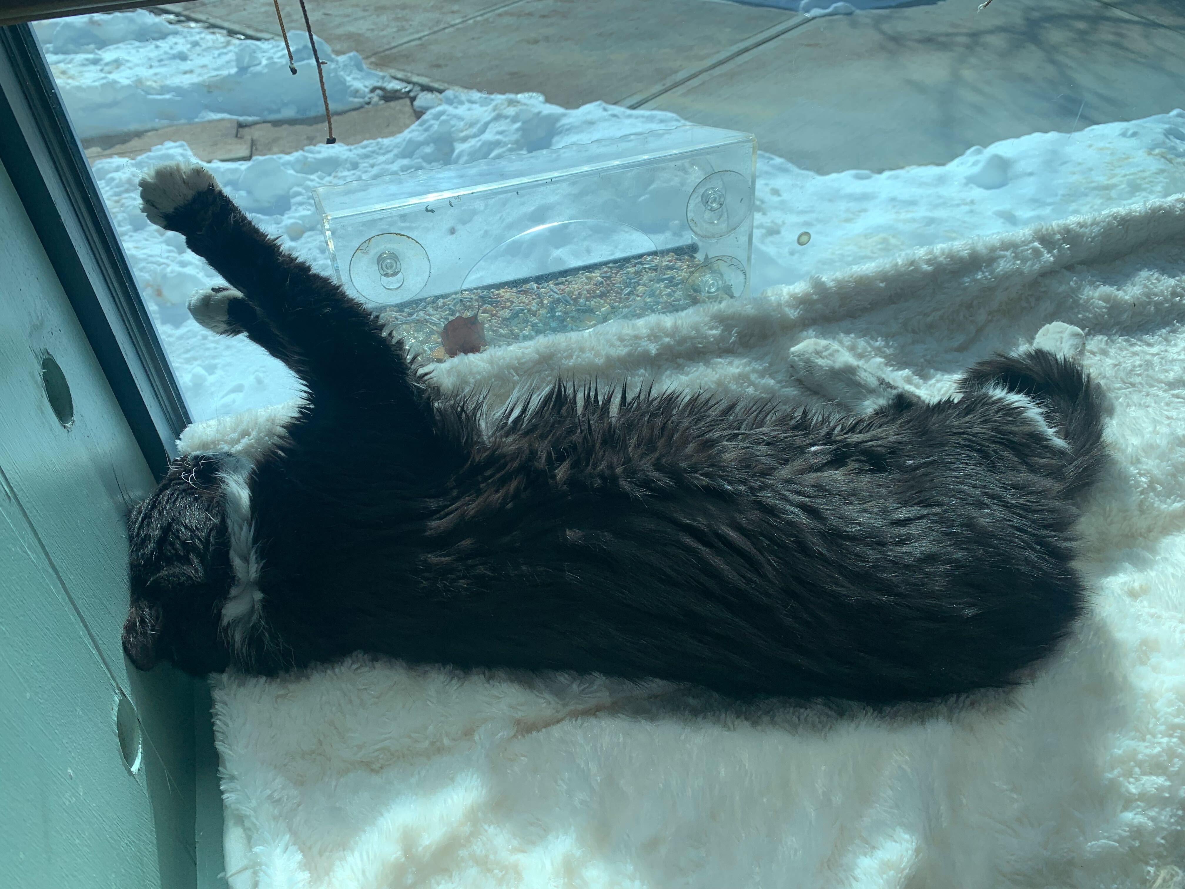 When I arrived, Tux was sound asleep in the sunny window box. I was surprised that he didn’t come to greet me, but I understood that a deep catnap in the sun was not to be disturbed. As soon as Tux woke up and noticed that work was going on without him, he came running over to investigate and get love and pets.