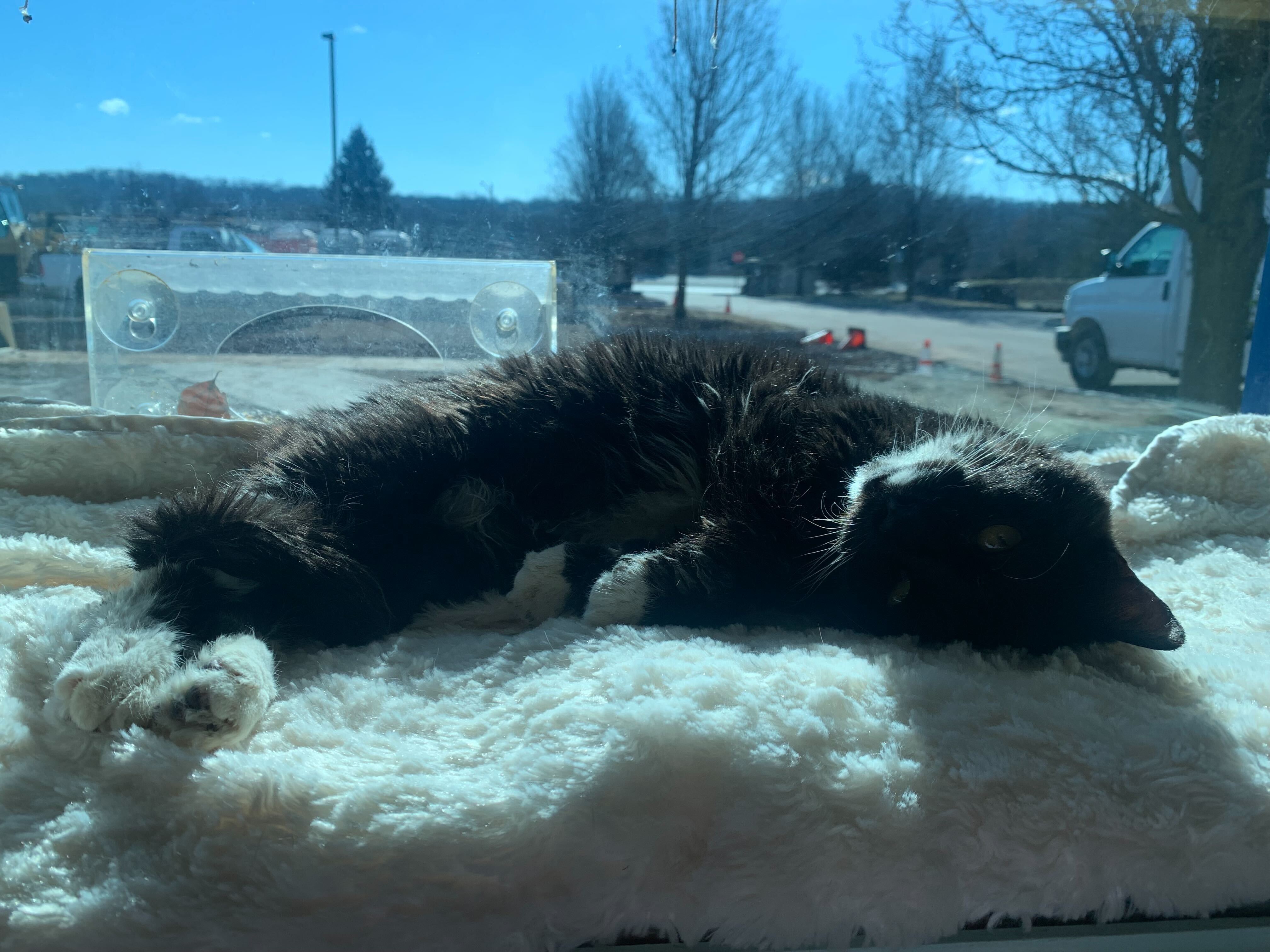 Warmer weather (between snow squalls) has met with the return of stroller walks! Tux has enjoyed a few loops around the grounds of Tabby’s Place where he took in a new perspective on the construction. He can’t wait for the expanded sidewalks around our sanctuary to be completed and opened to all. Bursting buds and flitting birds are wonderful entertainment from the Community Room windows which are once again bursting with sunshine.