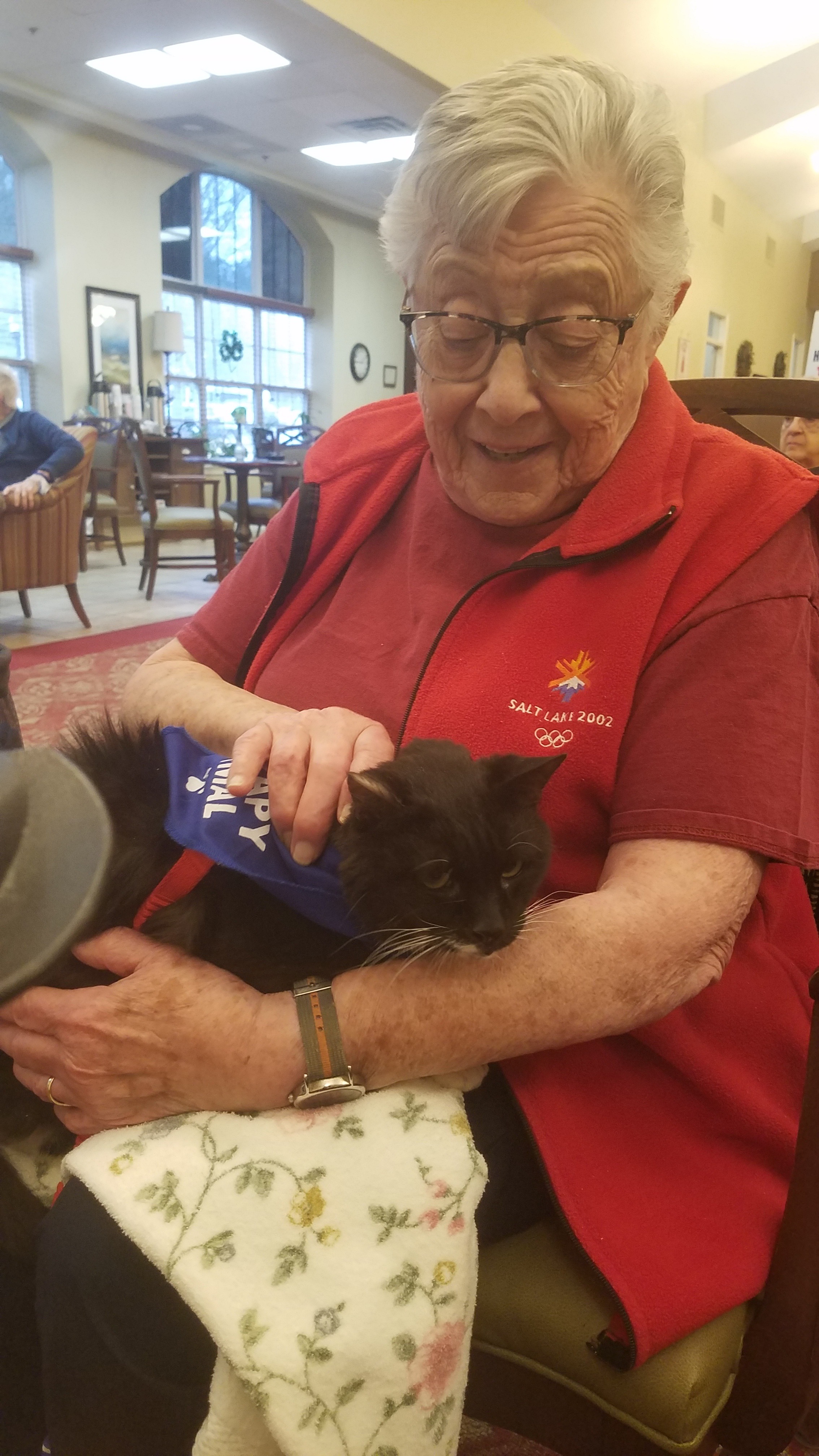 With restrictions lifting and infection numbers dropping in our region, Tabby’s Place is once again starting up its Aged to Purrfection program. If you aren’t familiar with this particular outreach program, we have a number of certified therapy cats that will visit local assisted living communities so that residents can enjoy some feline companionship and love. Tux is one of our best ambassadors and was thrilled to make a visit this month to the residents at Brookdale. He enjoyed many warm laps and gentle pets!