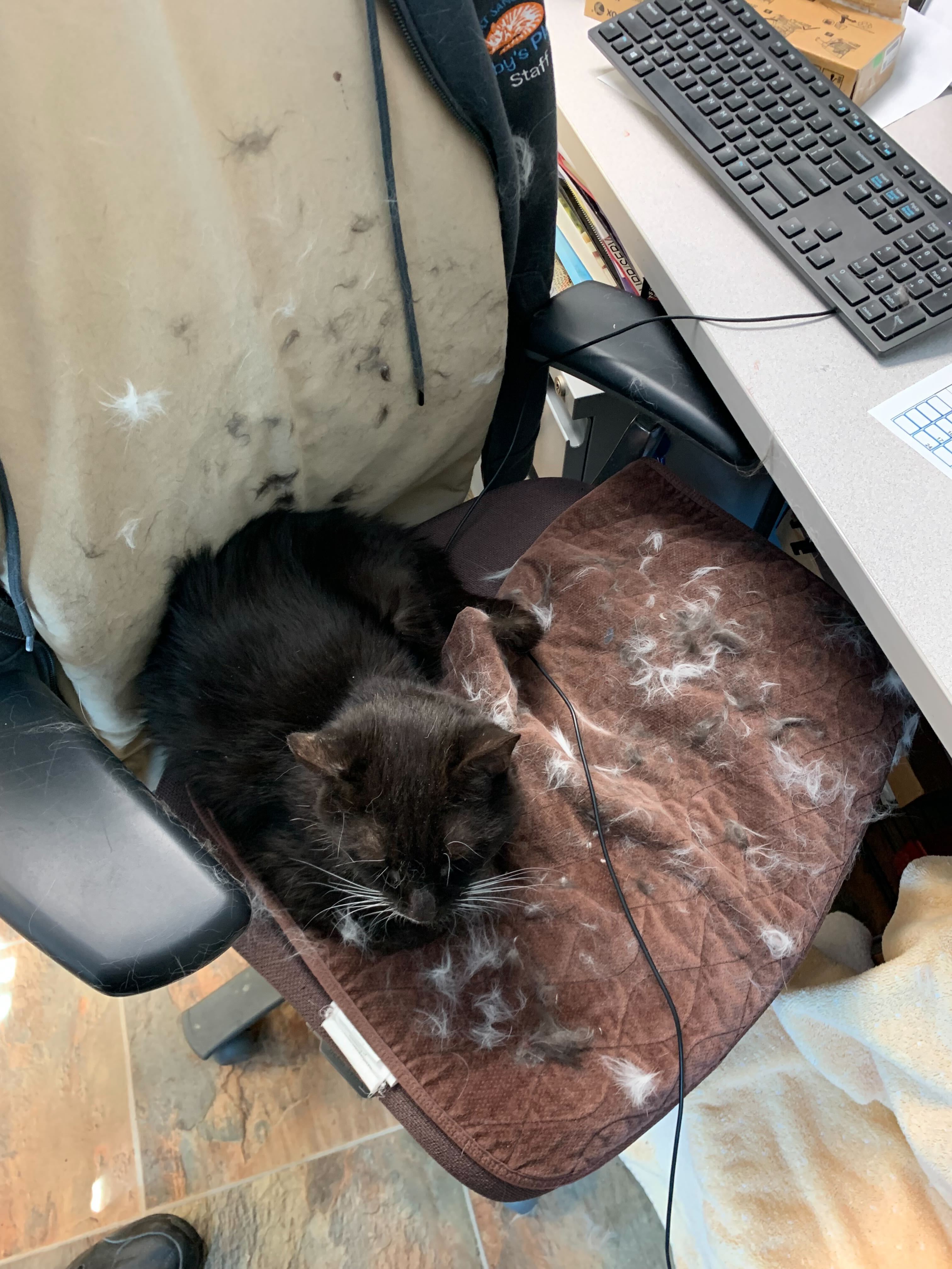 The growl was in response to none other than Frankie, who had just been released from his extended overnight crating (for poor behavior) and was on the prowl around the room. Every time Frankie came within a few feet of Tux (despite being elevated), Tux would growl softly and look unsettled. Just a few weeks ago, Frankie and Tux got into a scuffle that resulted in a great deal of hair loss by Tux (see photo). The best way to intervene in these altercations is to put Frankie in a “time-out” back in his crate. We have tried to simply move between the two cats, but Frankie is very focused when he wants to annoy another cat, and crating him seems to be the only way to draw his attention away.