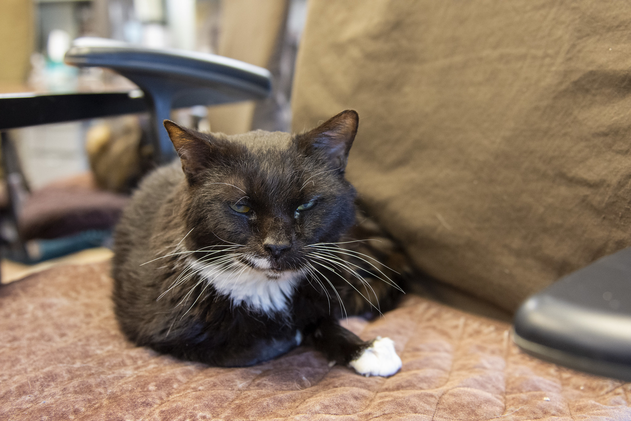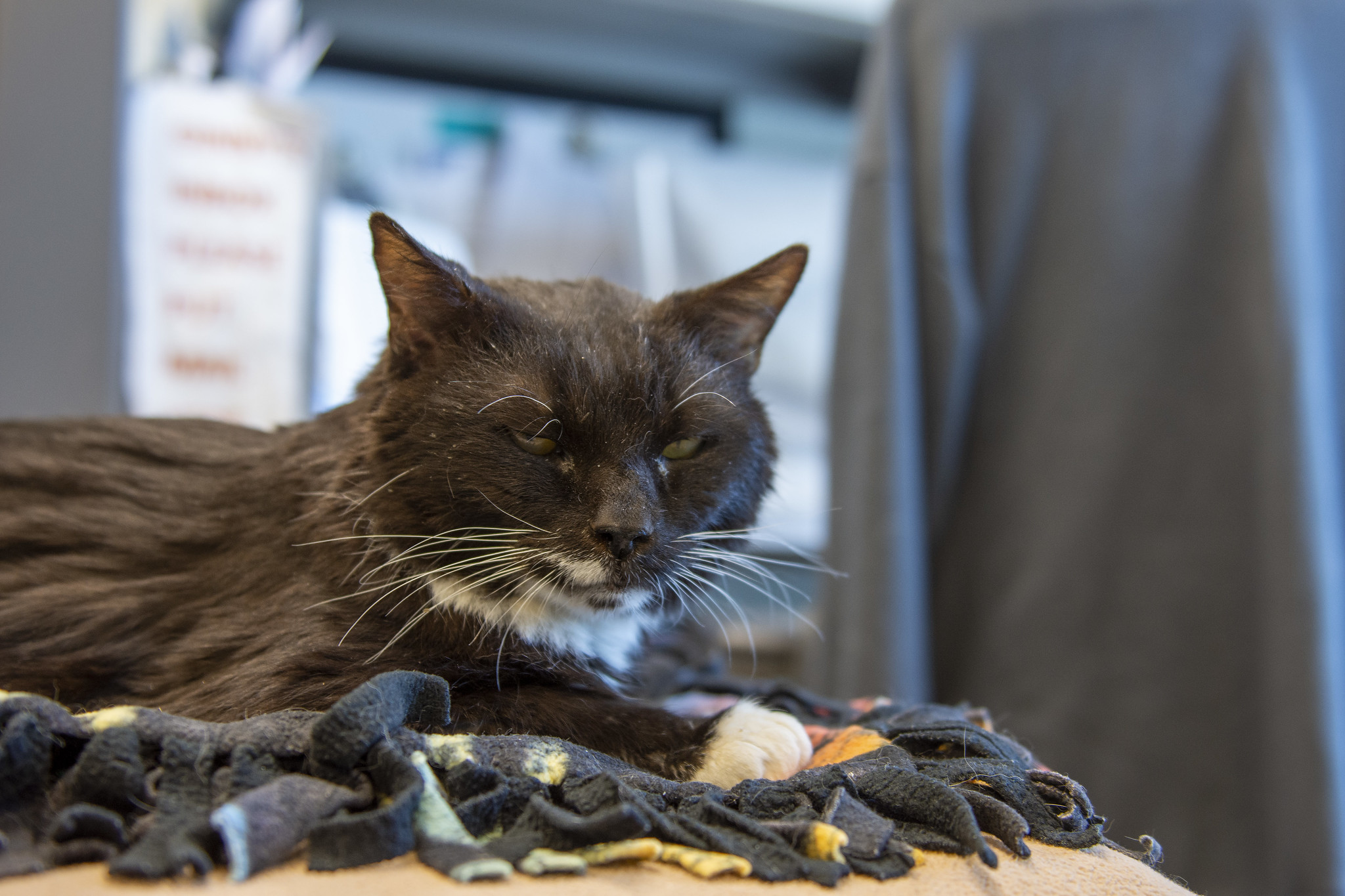 Tux and I got to enjoy some time together recently, only to have it complicated by Frankie. I was working in the Community Room that day and Tux had been crated overnight in the medical suite for a stool check (which was on the softer side for him). He was thrilled to return to the Community Room shortly after our morning meeting and decided that everything needed to be thoroughly sniffed and investigated. I love watching Tux when he is in “investigation mode.” He moves around with such purposeful focus while his nose twitches and surfaces get cheek rubs. The room met his approval and Tux moved into his favorite elevated place in a cozy bed by the corner desk. I was set up at that workstation with Dani on my lap. All was well until I heard a soft growl come from my left. I looked to see what was going on and realized that the growl was coming from our dear Tux. I have rarely heard Tux growl. He purrs and he meows, but growling is not really in his standard repertoire. I will say that his growl is as dignified and gentlemanly, as you might expect.