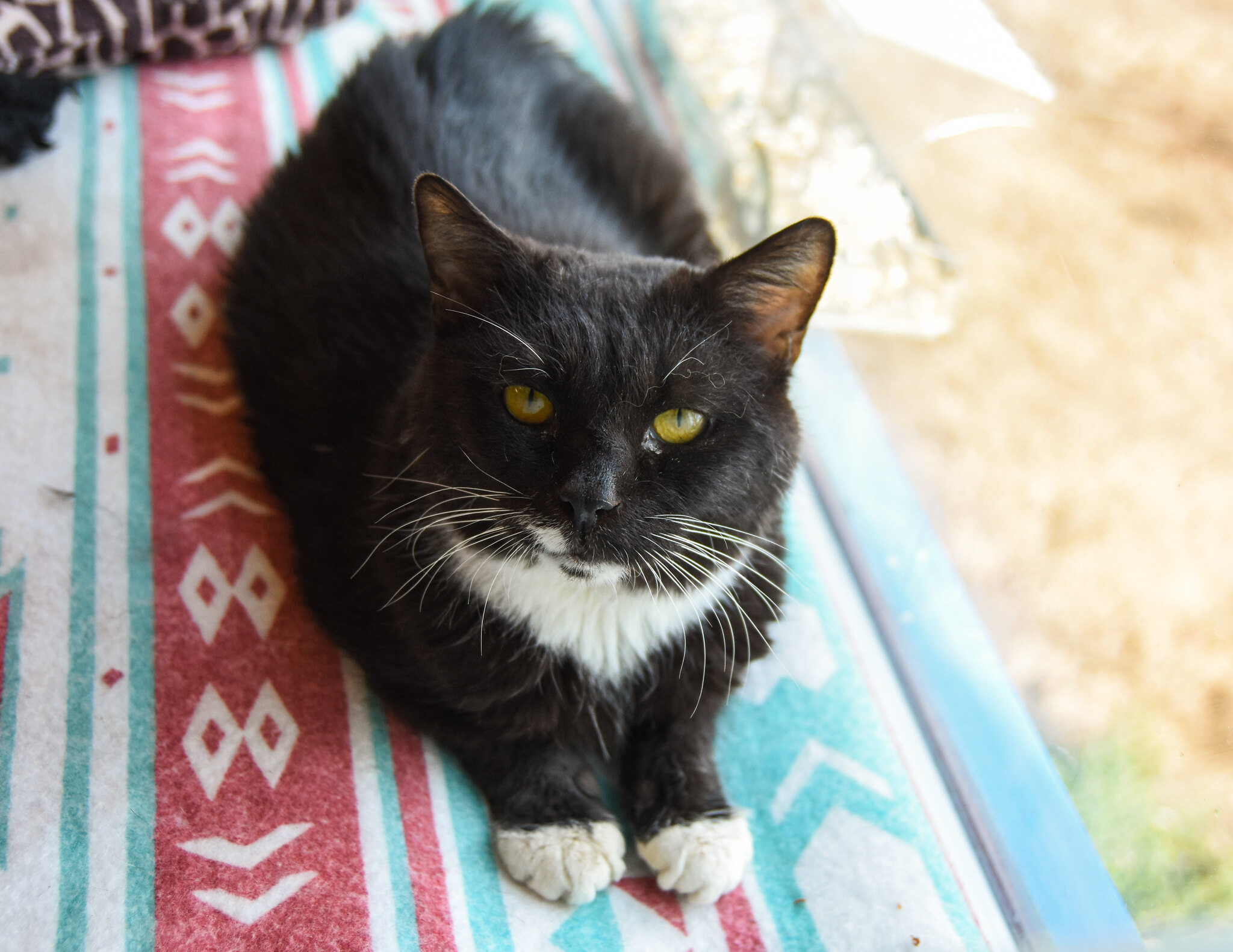 Tux always tries his best to look on the sunny side of things, but keeping a positive outlook has been a bit challenging for him this month. To put things in context, we (Tux and I) would like to share a little news about the goings-on in the Community Room of Tabby’s Place. A short time ago some new cats joined the Community Room residents. Frankie and Jeannie are both older felines and know one another from their previous living arrangement. While the two seem to understand one another quite well and enjoy human attention, they are not particularly fond of or appropriate with the other residents of the Community Room. Frankie seems to have a particular interest in bullying Tux.