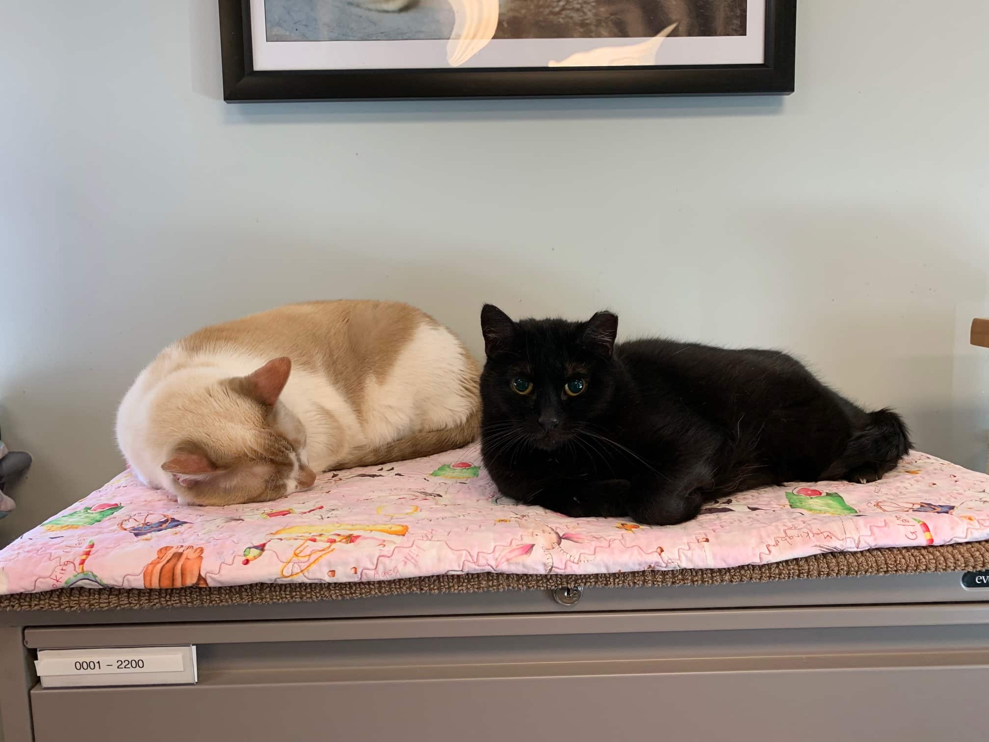 At this very hour, Tux is curled up on my right purring for all to hear, Dani is in my lap, Polly is napping in a bed to the left of my chair, Carley Rose is bathing on a pile of blankets in the nearest window, June is in her hidey bed, and Claire is resting on the filing drawers. This is a description of only one side of the Community Room