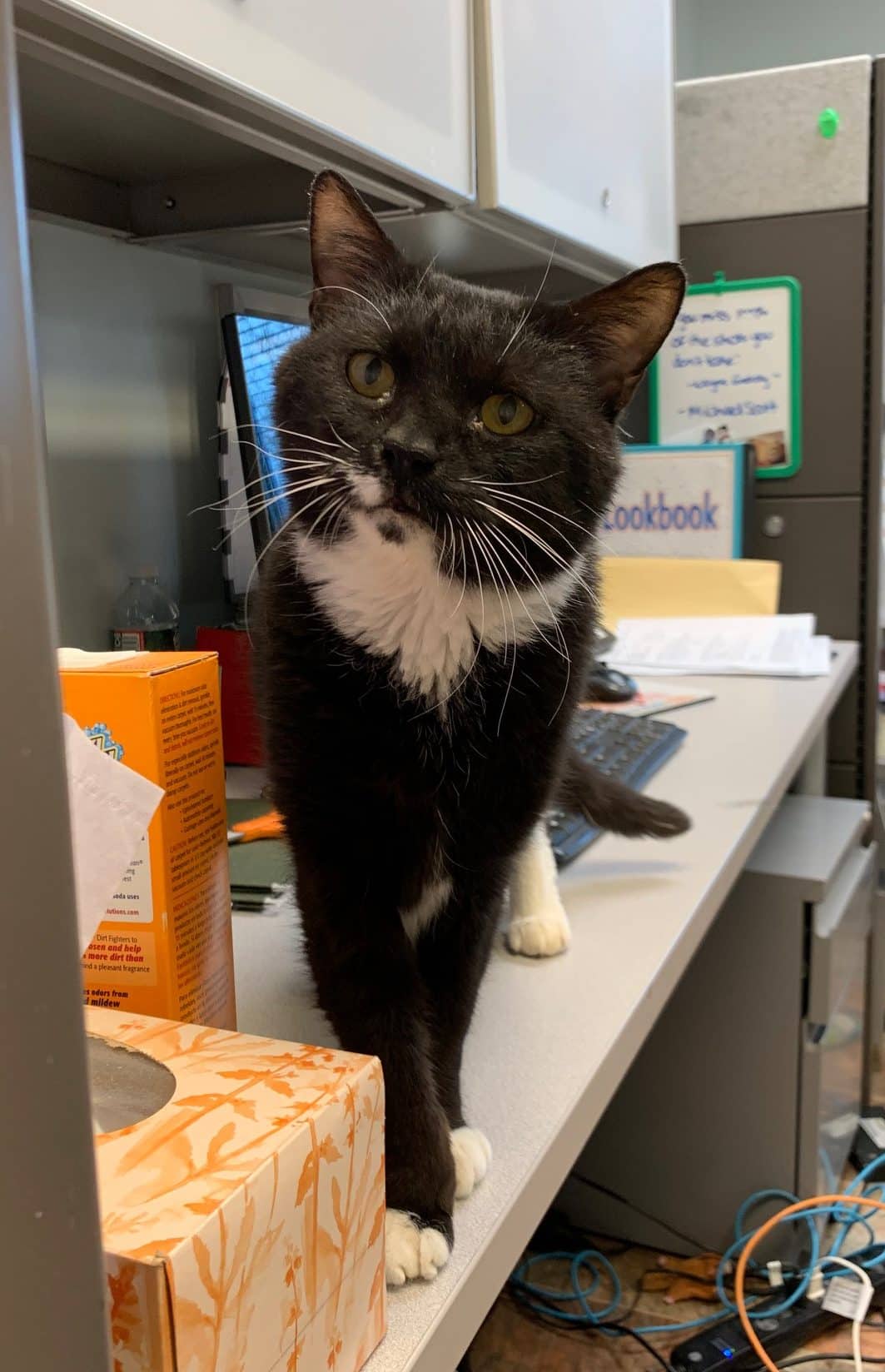 While we wait for their move-in date, Tux remains devoted to his work. Just this morning he came to check in on me to make sure I had not forgotten to write his update. I was so pleased to capture his inquisitive look! Now that he knows I am sticking to my responsibilities, he has settled himself on Ginny’s work desk to oversee her daily tasks.