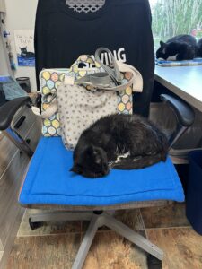 One of Tux’s long-time feline friends in the Community Room is Aries. Aries has endured a list of unfortunate and rare medical conditions, the likes of which we have not dealt with before. When his symptoms flare, Aries can be very uncomfortable. To help with his comfort, he gets medication two times a day, and Aries really dislikes getting his meds. For the staff, this means a daily routine of “keep away” as Aries attempts to avoid getting his medications. We typically have to grab a teammate to help catch him.
