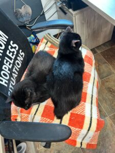 I am quite familiar with the process as I help to medicate our cats every week. But this one Sunday evening was different. There are a number of medications given in the Community Room in the evenings, and both Tux and Aries get medicated as the last two in the room. During the entire time that I was tending to the various Community Room cats, Tux and Aries were curled up together on Ginny’s desk chair. I knew they were there and kept thinking Aries was going to run the next time I looked his way. But this particular evening, he didn’t run.