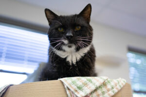Tux has so much to be grateful for this year, and it all begins with your love and friendship! Tux is grateful for every hand-delivered meal (even if he doesn’t eat it right away). He is grateful for each visit with his human and feline friends. Tux is grateful that his dear friend Patches continues to thrive in her forever foster home. And, this month, Tux is grateful that his beloved Community Room is no longer under ringworm quarantine precautions.