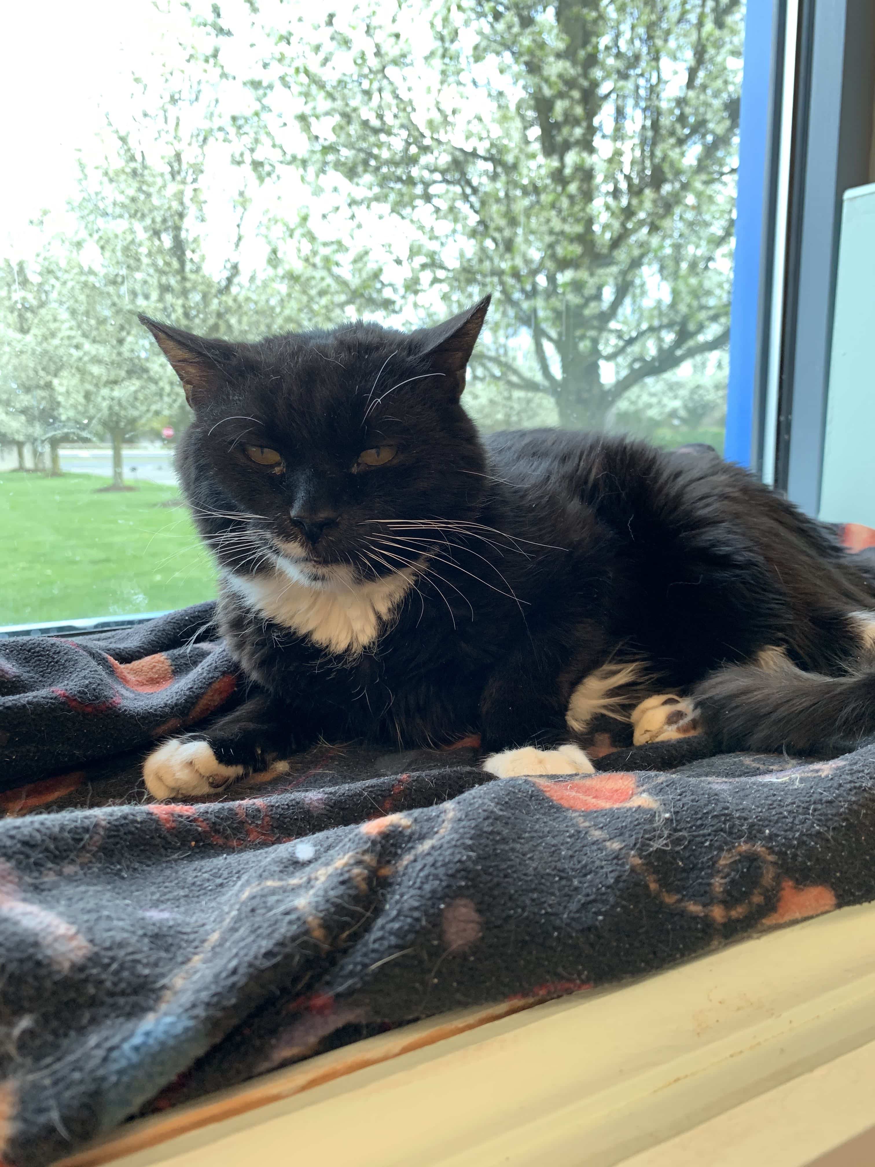 Tux has continued to experience good health this month. I believe that he is one of the cats for whom the world has not gone topsy turvy. His daily rhythm of food, fun, and rest has barely skipped a beat, thanks to your continued sponsorship. When I find myself feeling flustered, thinking of Tux brings a sort of zen my way.